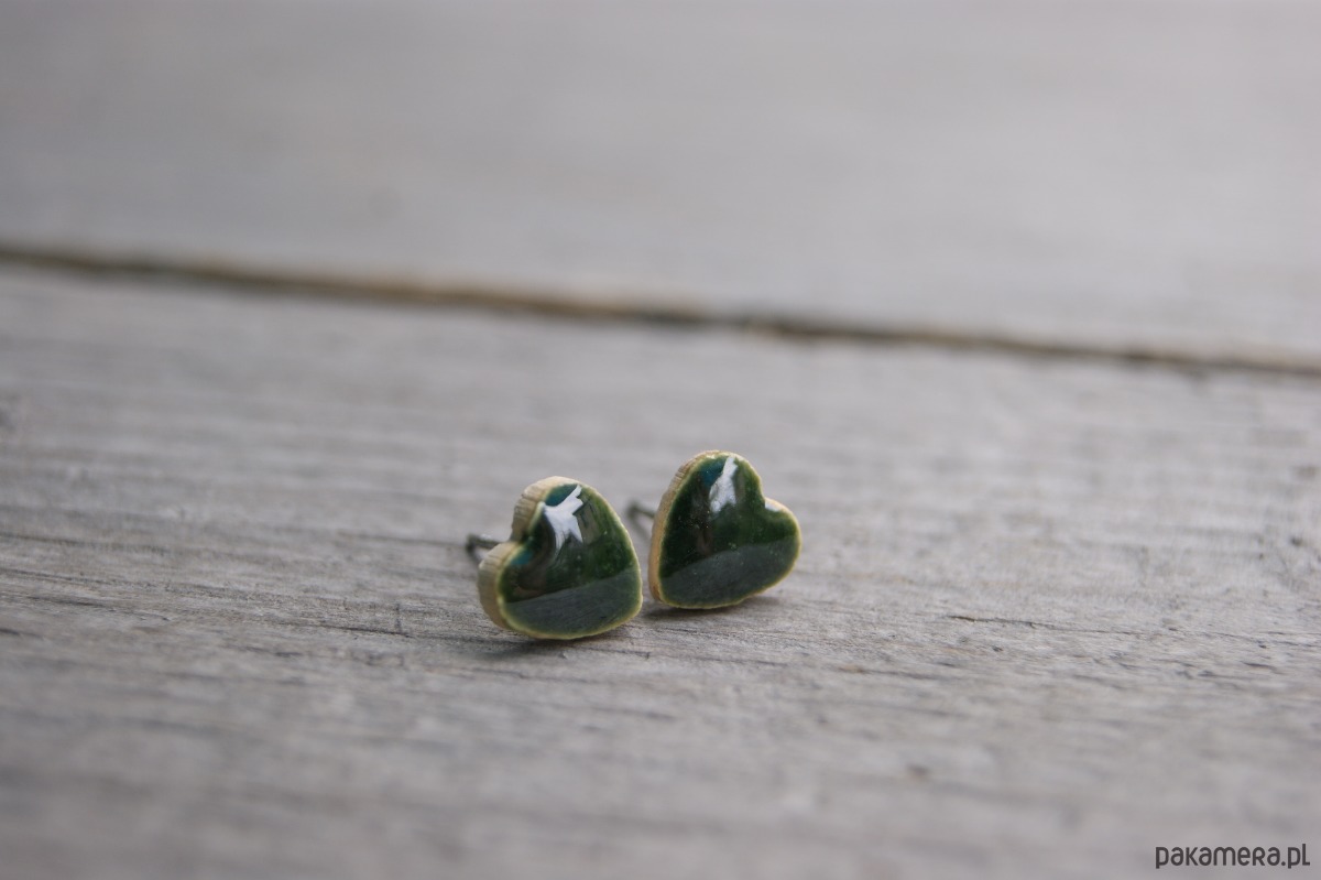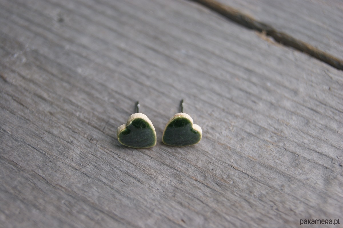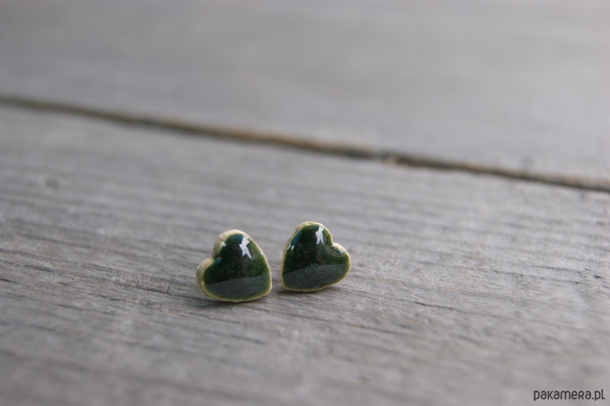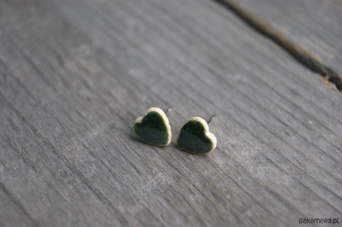 Cudowne ceramiczne kolczyki w kształcie serduszek. Wykonane z jasnej gliny pokryte soczystym ciemno zielonym błyszczącym szkliwem.