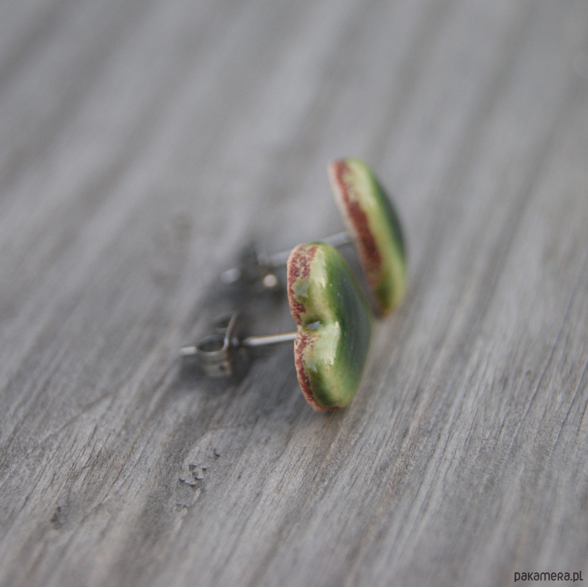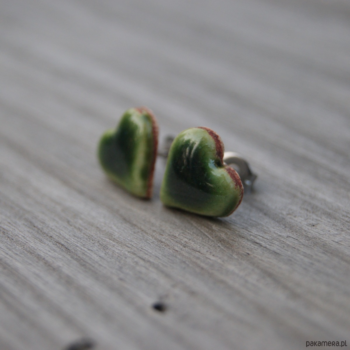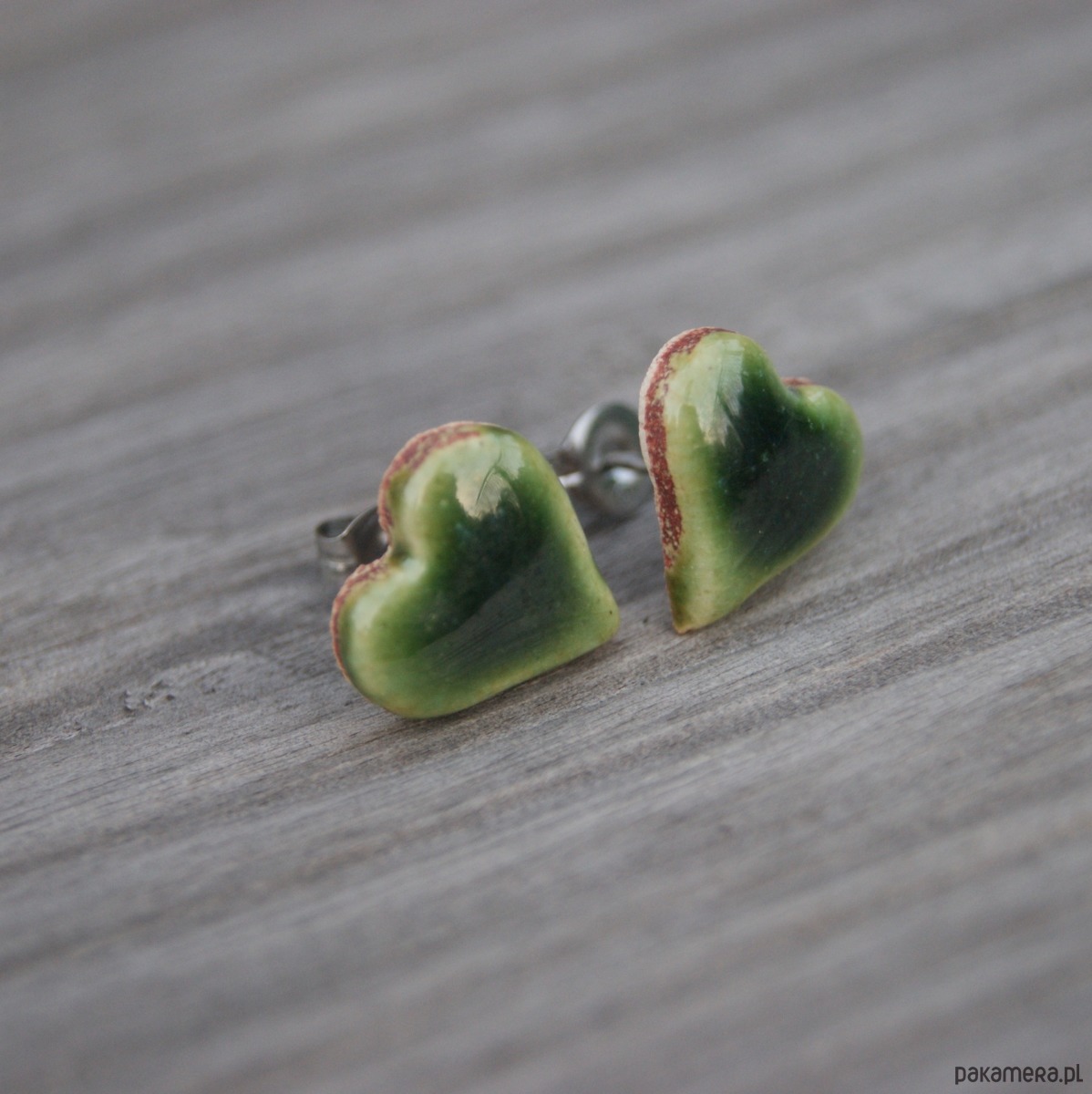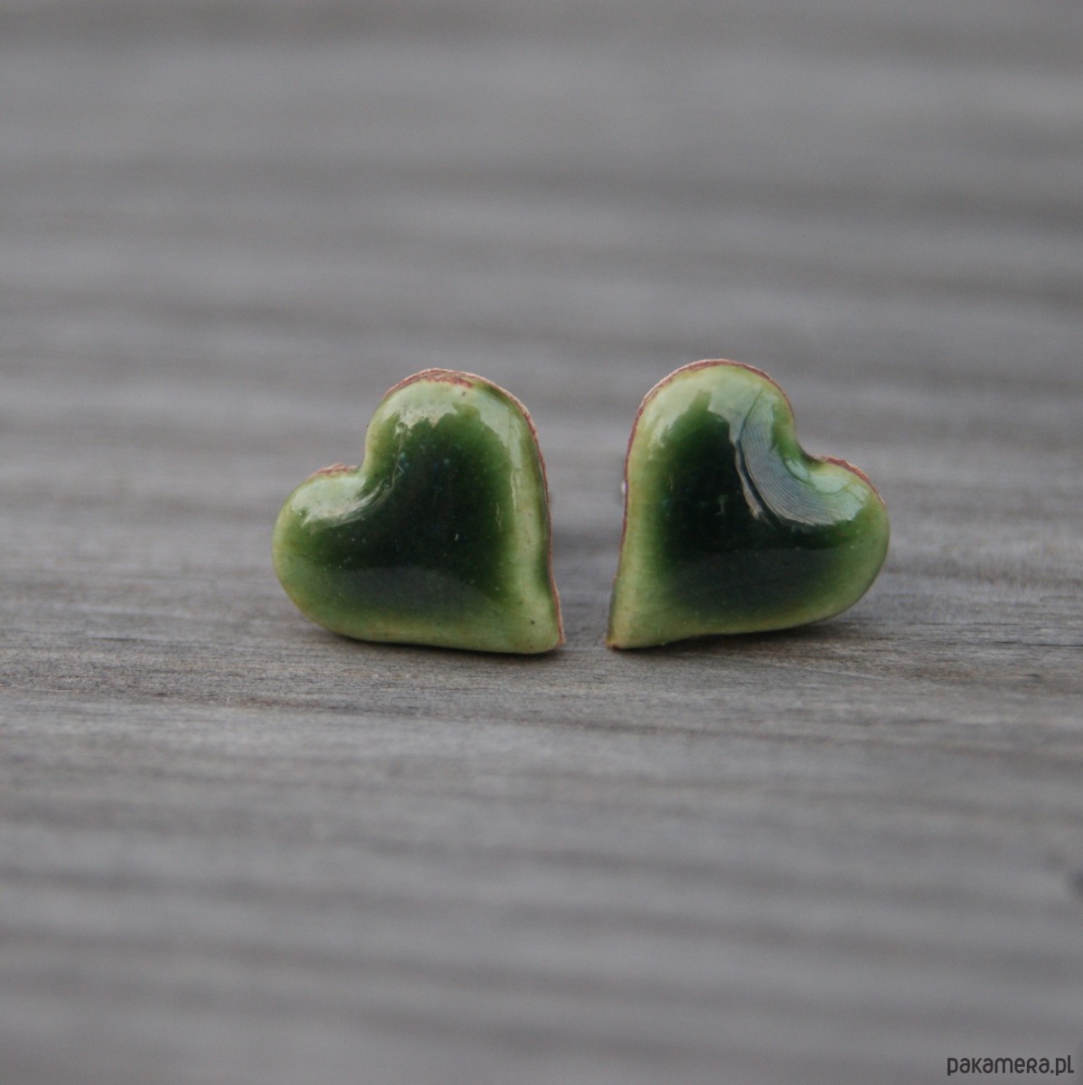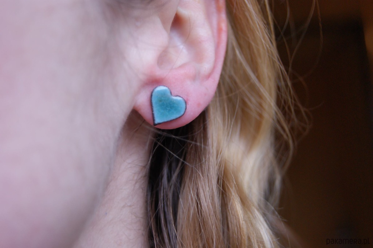 Śliczne małe ceramiczne kolczyki sztyfty w kształcie serduszek. Wykonane z lekkiej jasnej gliny pokryte zielonym błyszczącym szkliwem które nadają im wyjątkowy powierzchnię.
