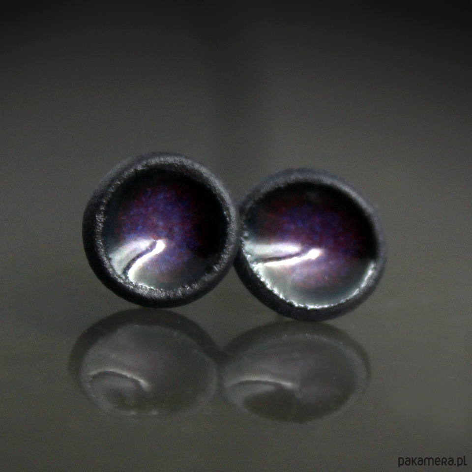 Efektowne nieregularne kolczyki w formie sztyftów, ręcznie wykonane z delikatne czarnej porcelany, jednostronnie szkliwione efektownym czarno fioletowym szkliwem, na antyalergicznych sztyftach w kolorze srebrnym. średnica elementu ceramicznego ok. 11mm, grubość około 4mm Polecam