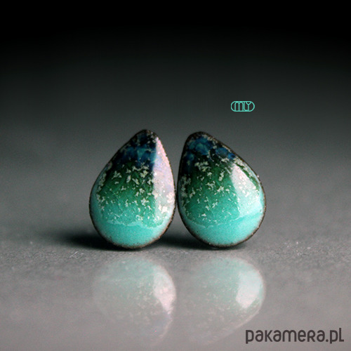 Ceramiczne kolczyki w formie sztyftów, ręcznie wykonane z delikatnej czekoladowobrązowej gliny kamionkowej, jednostronnie szkliwione mieszanką zielonych szkliw z efektem plamek, na antyalergicznych sztyftach w kolorze srebrnym. Długość ok. 13mm. Polecam