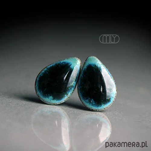 Ceramiczne kolczyki w formie sztyftów, ręcznie wykonane z delikatnej czekoladowobrązowej gliny kamionkowej, jednostronnie szkliwione mieszanką zielonych i błękitnych szkliw z efektem plamek, na antyalergicznych sztyftach w kolorze srebrnym. Długość ok. 13mm. Polecam