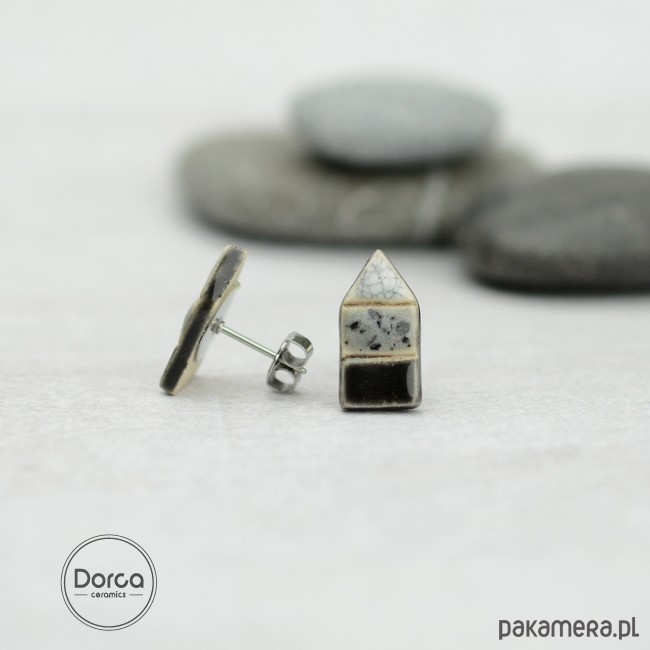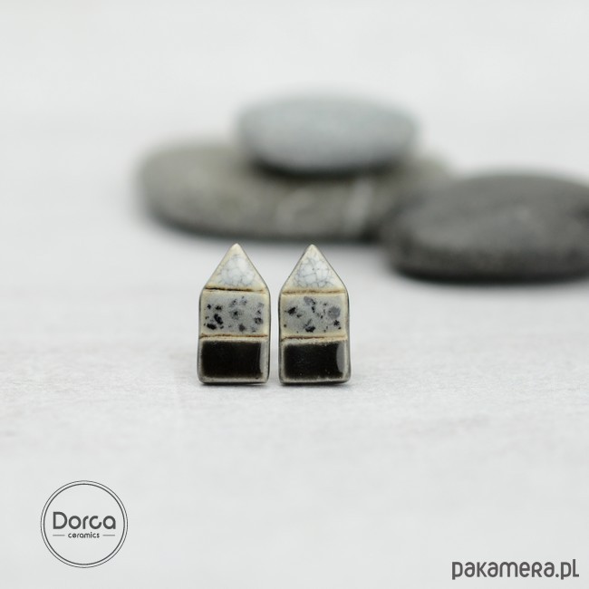 Kolczyki to ceramiczne elementy wykonane od podstaw ręcznie. Ich wymiary to 1,5cm wysokość, 0,8 cm szerokość, 2mm grubość. Elementy zostały ozdobione wzorem trójkątów, poszkliwionych w kolorystyce: biel ze spękaniami, szarośc w czarne plamki, czerń. Ceramiki zostały solidnie umocowane na antyalergicznych sztyftach ze stali chirurgicznej- w kolorze oksydowanego srebra. Sztyfty są umocowane w środkowej części elementu ,co umożliwia noszenie ich w różnych ułożeniu . Minimalizm i geometria w jednym!! Polecam!!! Wysyłam ozdobnie zapakowane.
