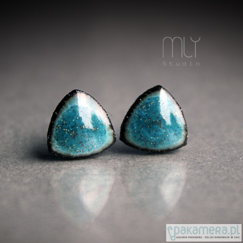 Ceramiczne kolczyki w formie sztyftów, ręcznie wykonane z delikatnej gliny kamionkowej, jednostronnie szkliwione mieszanką niebiesko zielonych szkliw z efektem plamek i subtelnym połyskiem, na antyalergicznych sztyftach w kolorze srebrnym.Średnica ok. 10mm.. Polecam