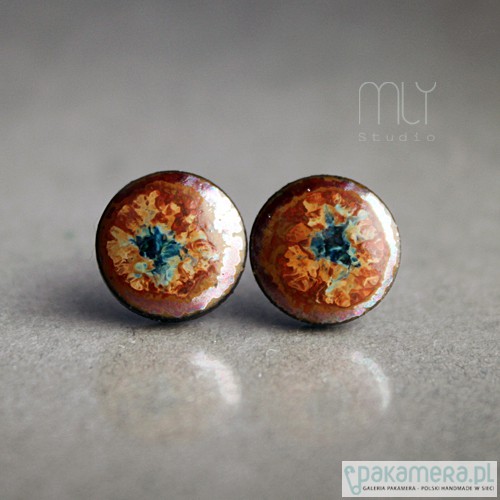 Okrągłe, lekko nieregularne ceramiczne kolczyki w formie sztyftów, ręcznie wykonane z delikatnej czekoladowobrązowej gliny kamionkowej, jednostronnie szkliwione mieszanką złoto brązowych i perłowobiałych szkliw z efektem plamek i subtelnym połyskiem, na antyalergicznych sztyftach w kolorze srebrnym. Średnica ok. 11mm.Polecam