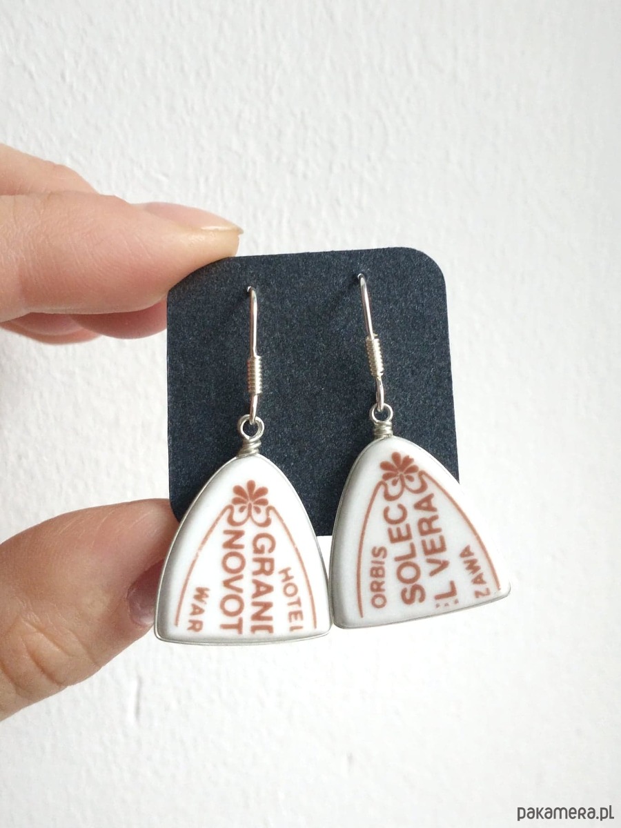 Kolczyki wiszące wykonane z fragmentów talerza z napisem Hotel Orbis Grand Solec Novotel Vera Warszawa. Fragmenty zostały oszlifowane, oprawione w drucik i połączone z biglami - wszystkie elementy metalowe wykonane są ze srebra próby 925. Wymiary elementów ceramicznych: 19 x 20 mm. Waga jednego kolczyka: 2,6 g. Każdy z moich wyrobów jest unikatowy - występuje w jednym egzemplarzu!
