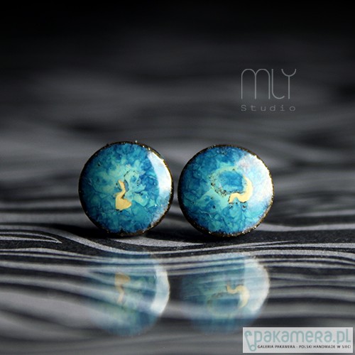 Ceramiczne okrągłe kolczyki w formie sztyftów, ręcznie wykonane z delikatnej gliny kamionkowej jednostronnie szkliwione błękitnym i zielonym szkliwem z efektem plamek i subtelnym połyskiem, na antyalergicznych sztyftach w kolorze srebrnym. Średnica ok.9mm. Polecam