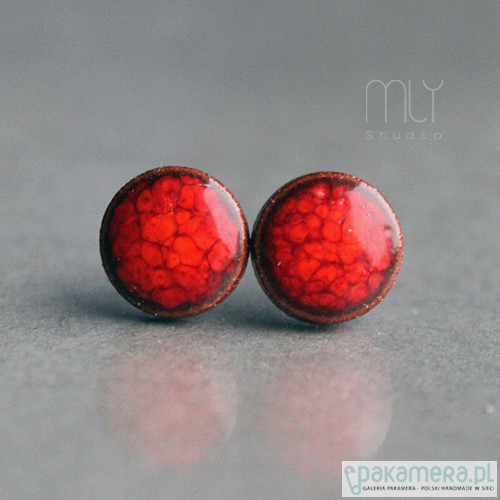 Ceramiczne okrągłe kolczyki w formie sztyftów, ręcznie wykonane z delikatnej gliny kamionkowej, jednostronnie szkliwione intensywnym czerwonym szkliwem z efektem plamek i pięknym połyskiem, na antyalergicznych sztyftach w kolorze srebrnym.Średnica ok. 11mm.. Polecam