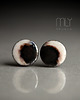 Ceramiczne, lekko nieregularne kolczyki w formie sztyftów, ręcznie wykonane z delikatnej szarej gliny kamionkowej, jednostronnie szkliwione efektownym białoperłowym i ciemnym srebrzystym szkliwem z efektem plamek i metalicznym połyskiem, na antyalergicznych sztyftach ze stali chirurgicznej w kolorze srebrnym. Średnica ok. 11mm. Polecam