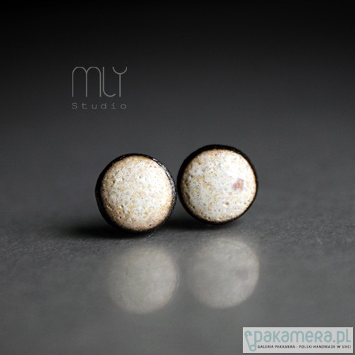 Ceramiczne okrągłe kolczyki w formie sztyftów, ręcznie wykonane z delikatnej gliny kamionkowej jednostronnie szkliwione matowym kremowym szkliwem z efektem plamek i pięknym połyskiem, na antyalergicznych sztyftach w kolorze srebrnym. Średnica ok. 6mm. Polecam