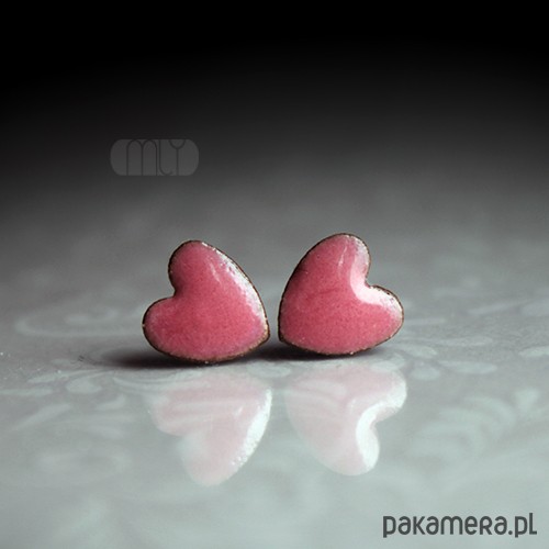 Ceramiczne kolczyki w formie sztyftów, ręcznie wykonane z delikatnej gliny kamionkowej, jednostronnie szkliwione różowym szkliwem z efektem plamek i subtelnym połyskiem, na antyalergicznych sztyftach w kolorze srebrnym.Średnica ok. 7mm.. Polecam