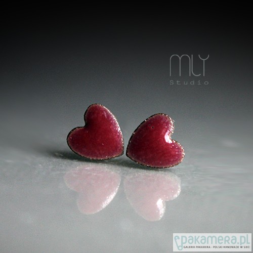 Ceramiczne kolczyki w formie sztyftów, ręcznie wykonane z delikatnej gliny kamionkowej, barwionej na błękit jednostronnie szkliwione ciemnobordowym szkliwem z efektem plamek i subtelnym połyskiem, na antyalergicznych sztyftach w kolorze srebrnym.Średnica ok. 7mm.. Polecam