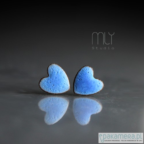 Ceramiczne kolczyki w formie sztyftów, ręcznie wykonane z delikatnej gliny kamionkowej, jednostronnie szkliwione błękitnym szkliwem z efektem plamek, na antyalergicznych sztyftach w kolorze srebrnym.Średnica ok. 7mm.. Polecam