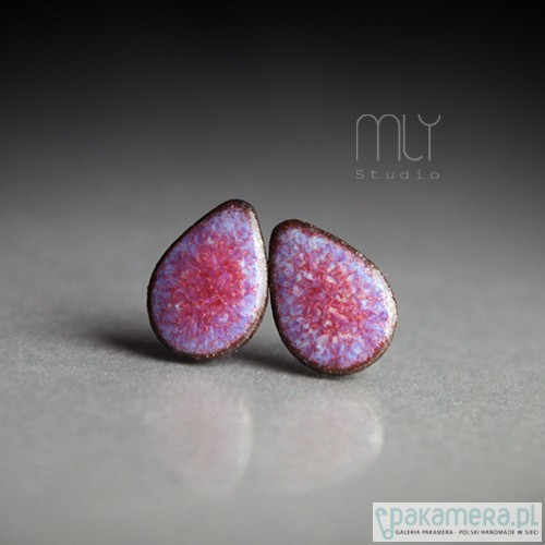 Ceramiczne kolczyki w formie sztyftów, ręcznie wykonane z delikatnej czekoladowobrązowej gliny kamionkowej, jednostronnie szkliwione mieszanką różowych szkliw z efektem plamek, na antyalergicznych sztyftach w kolorze srebrnym. Długość ok. 13mm. Polecam