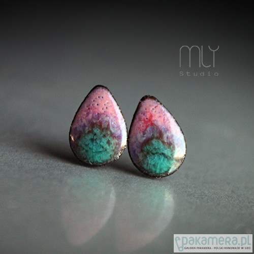 Ceramiczne kolczyki w formie sztyftów, ręcznie wykonane z delikatnej czekoladowobrązowej gliny kamionkowej, jednostronnie szkliwione mieszanką zielonych i różowych szkliw z efektem plamek, na antyalergicznych sztyftach w kolorze srebrnym. Długość ok. 13mm. Polecam