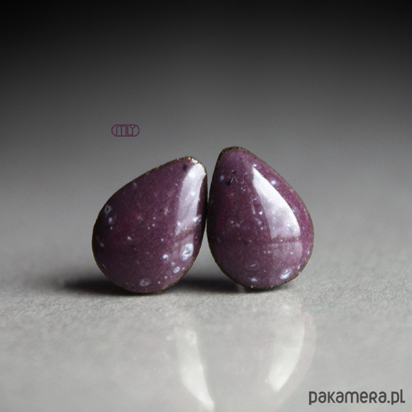 Ceramiczne kolczyki w formie sztyftów, ręcznie wykonane z delikatnej gliny kamionkowej, jednostronnie szkliwione mieszanką fioletowych szkliw z efektem plamek, na sztyftach w kolorze srebrnym. Długość ok. 13mm. Polecam