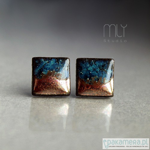 Ceramiczne kolczyki w formie sztyftów, ręcznie wykonane z delikatnej czekoladowobrązowej gliny kamionkowej, jednostronnie szkliwione mieszanką złotych i błękitno zielonych szkliw z efektem plamek, na sztyftach w kolorze srebrnym. długość ok. 11mm. Polecam