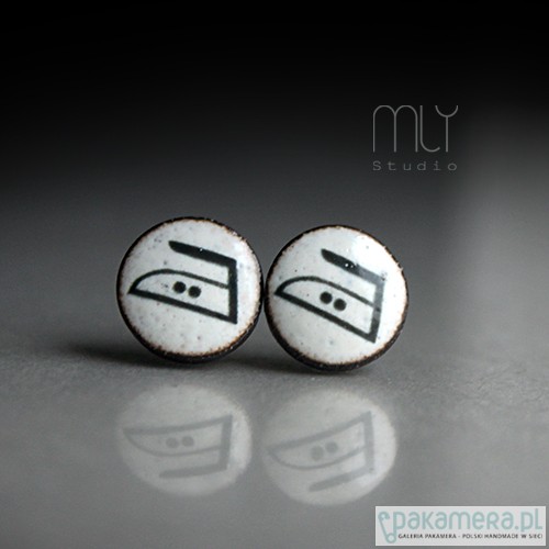 Ceramiczne okrągłe kolczyki, ręcznie wykonane z delikatnej gliny kamionkowej, jednostronnie szkliwione białym szkliwem z efektem plamek, dekorowane autorska kalką ceramiczną w kolorze czarnymm,na antyalergicznych sztyftach w kolorze srebrnym.Średnica ok. 11mm. Polecam