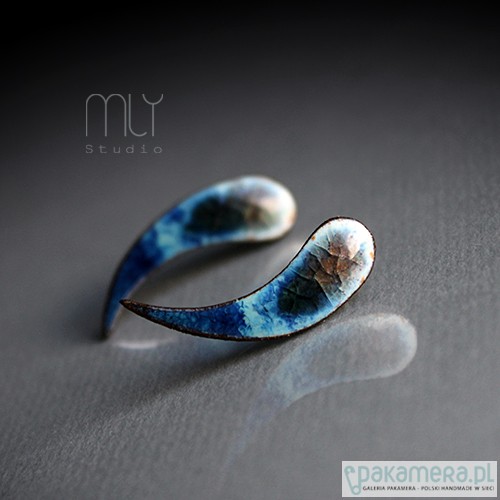 Ceramiczne podłużne kolczyki, ręcznie wykonane z delikatnej gliny kamionkowej, jednostronnie szkliwione mieszanką błękitnych i kremowo brunatnych szkliw z efektem plamek, tył matowy czekoladowobrązowy na antyalergicznych sztyftach w kolorze srebrnym.długość ok 2,8cm. Polecam