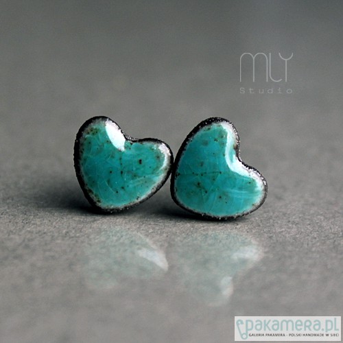 Ceramiczne kolczyki w formie sztyftów, ręcznie wykonane z delikatnej gliny kamionkowej, jednostronnie szkliwione zielonym szkliwem z efektem plamek i subtelnym połyskiem, na antyalergicznych sztyftach w kolorze srebrnym.Średnica ok. 12mm.. Polecam