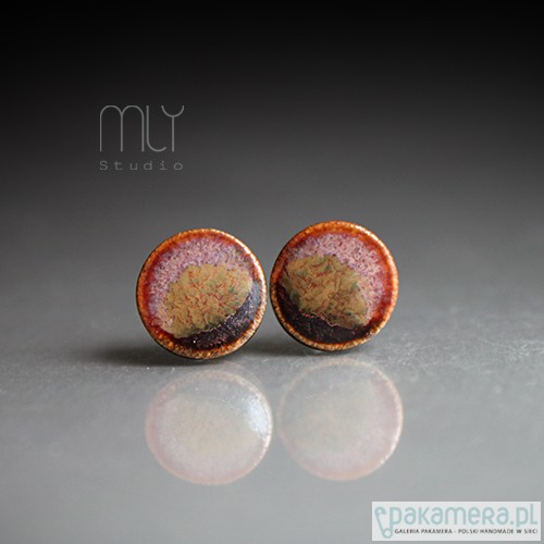 Ceramiczne, lekko nieregularne kolczyki w formie sztyftów, ręcznie wykonane z delikatnej gliny kamionkowej, jednostronnie szkliwione efektowną mieszanką błyszczących beżowo brązowych i czerwonych szkliw z efektem plamek, na antyalergicznych sztyftach w kolorze srebrnym.Średnica ok. 9mm. Polecam