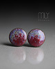 Ceramiczne okrągłe kolczyki, ręcznie wykonane z delikatnej gliny kamionkowej, jednostronnie szkliwione mieszanką fioletowych i różowych szkliw z efektem plamek, na antyalergicznych sztyftach w kolorze srebrnym. Średnica ok. 9mm. Polecam
