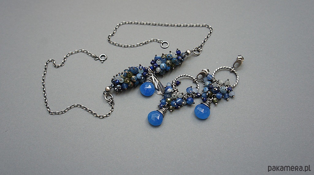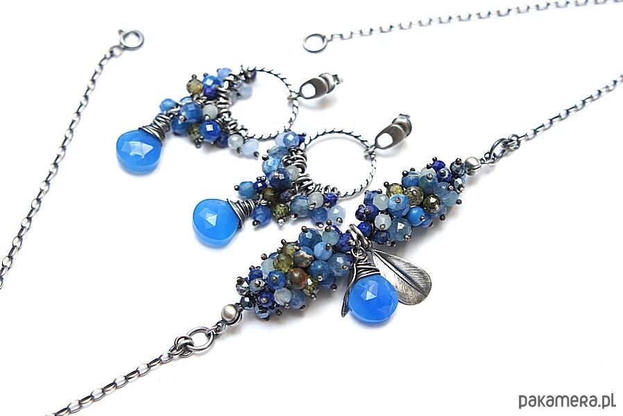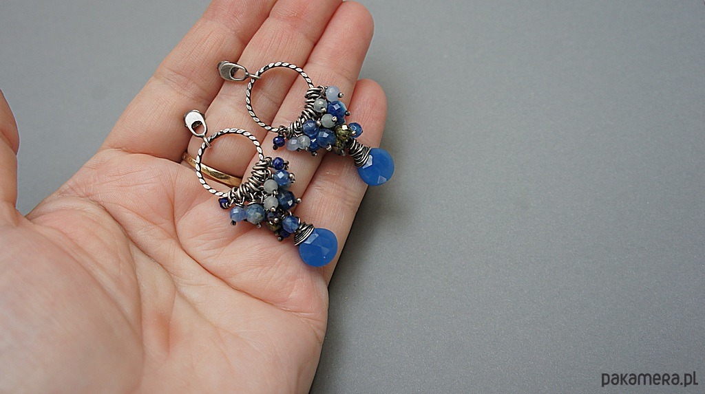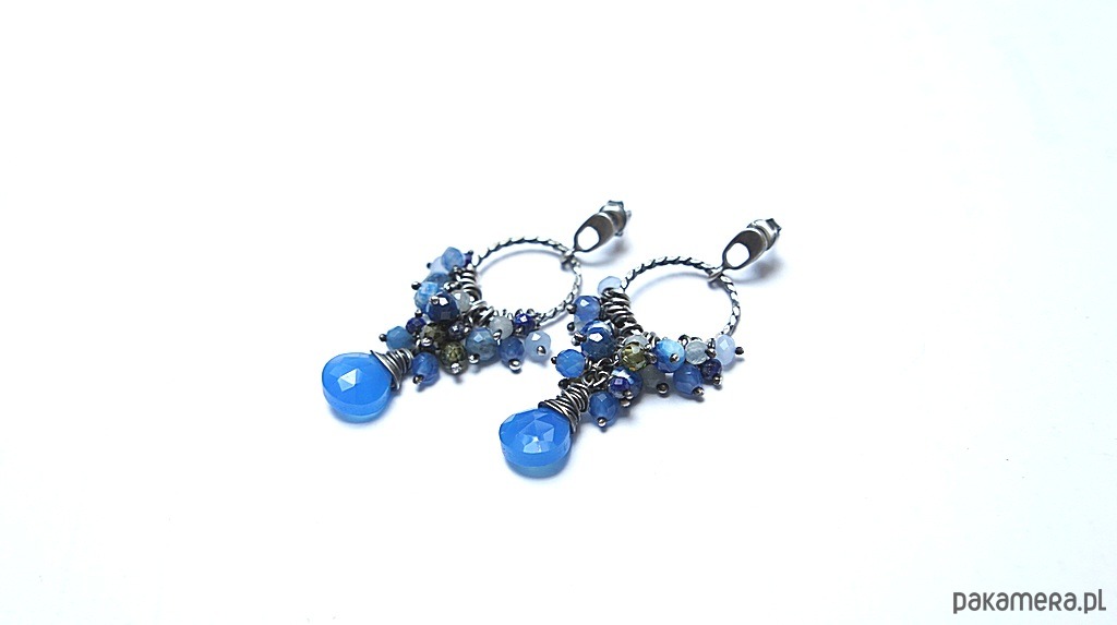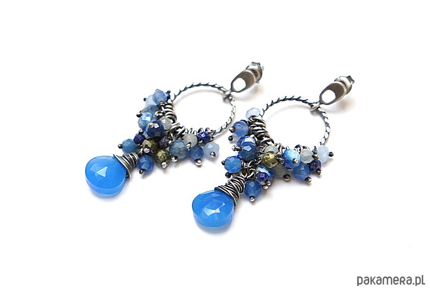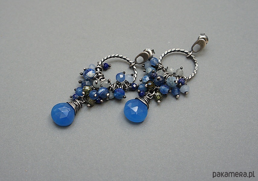 Kolczyki wykonane od podstaw ze srebra [pr. 925] w połączeniu z cebulkami chalcedonu w chabrowym kolorze, oplecionych drutem [pr. 999 - 10mm] oraz kuleczkami kyanitów [6mm], akwamarynów [3,5mm], jadeitów [4mm], lapisów lazuli [3mm], kryształków [4mm] oraz oliwinowych cyrkonii [4mm]. Średnica kół [16mm]. Całość oksydowana i przetarta. Całkowita długość kolczyków 5,5cm. Biżuteria ozdobnie zapakowana. Do kompletu można dokupić naszyjnik przedstawiony na zdjęciach.