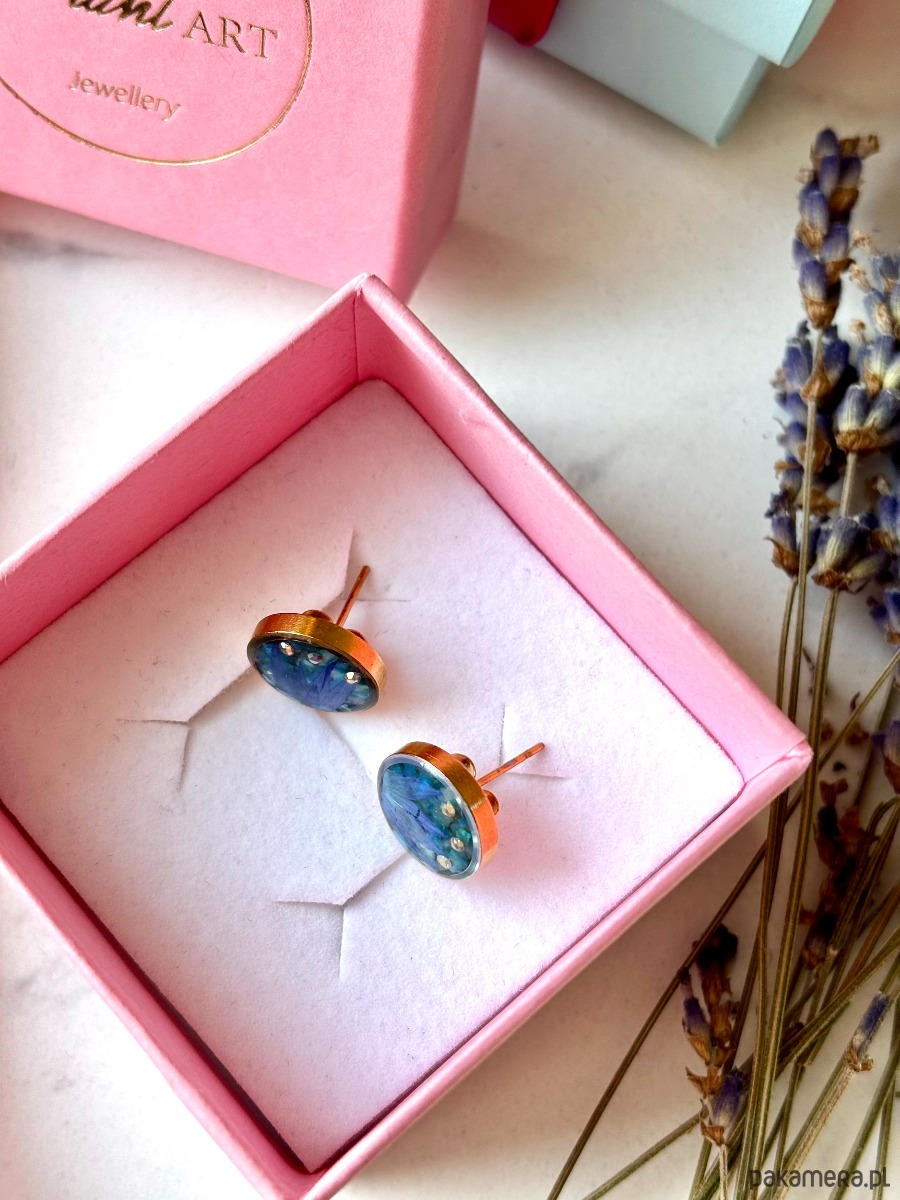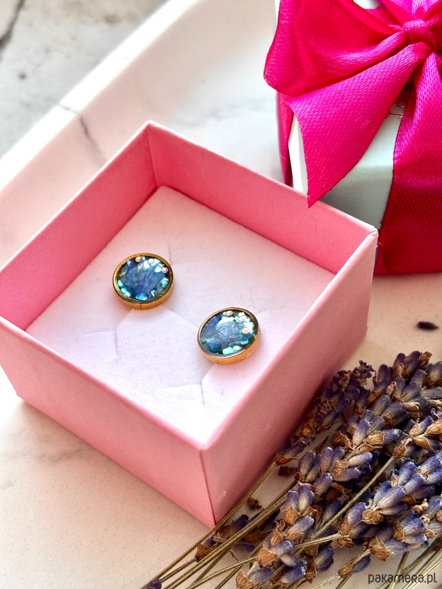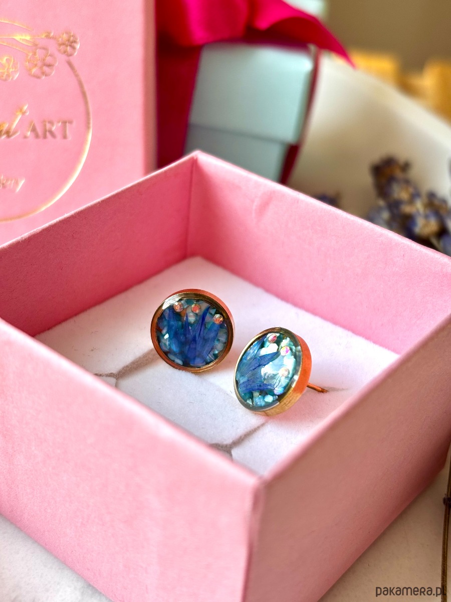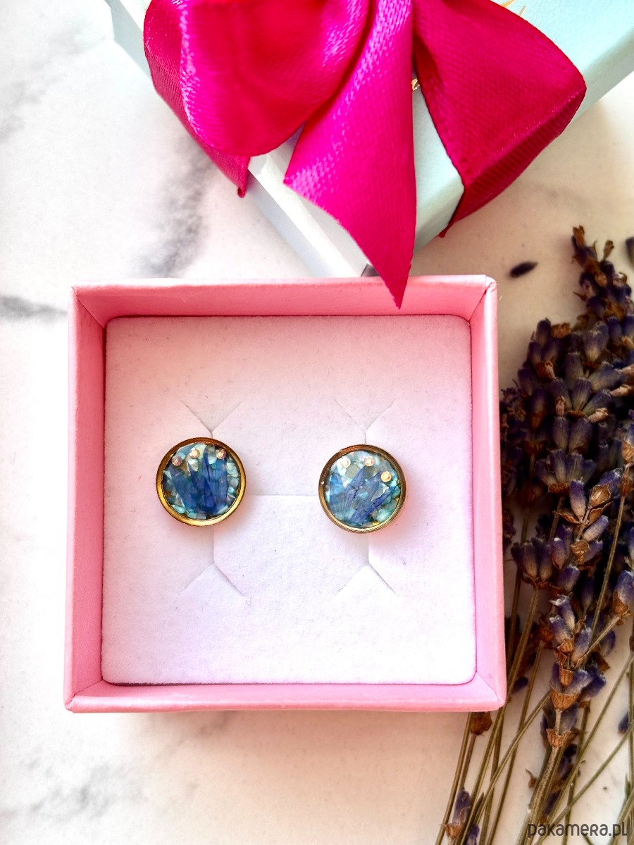 Ręcznie wykonane kolczyki z okrągłymi zawieszkami . Biżuteria wykonana jest z wyselekcjonowanych płatków kwiatów chabra, na tle z niebieskich płatków masy perłowej. Kolczyki pięknie prezentują się na uchu, są efektowne i wyjątkowo lekkie co stanowi komfort noszenia.
