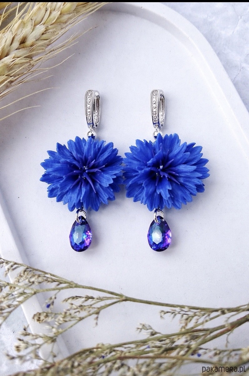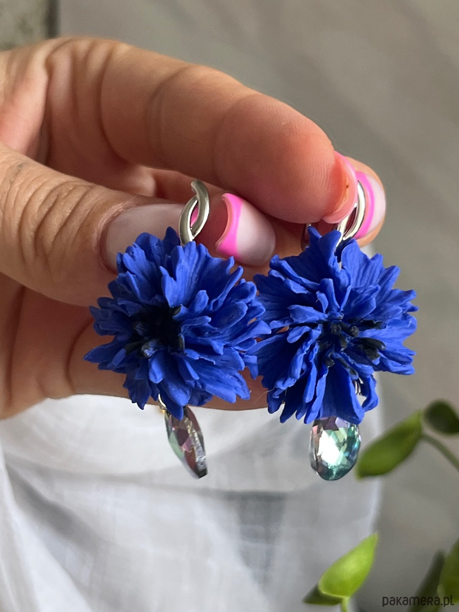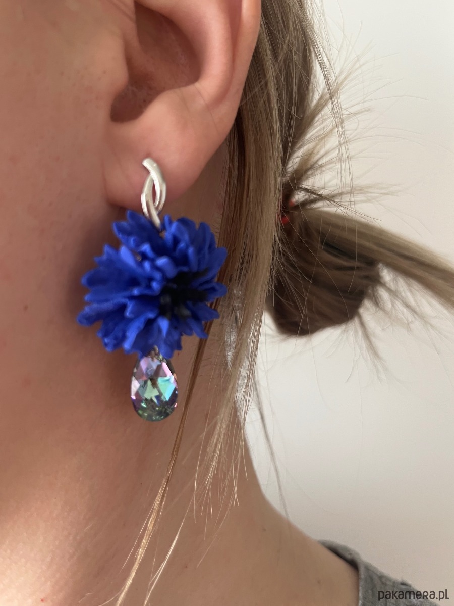 Eleganckie, przyciągające wzrok kolczyki w intensywnych odcieniach błękitu, inspirowane naturalnym pięknem kwiatów. Centralnym elementem kompozycji są efektowne, trójwymiarowe kwiaty przypominające chabry — symbol delikatności i świeżości. Ich bogata struktura złożona z wielu cienkich płatków nadaje biżuterii lekkości, objętości oraz wyjątkowej głębi wizualnej.
