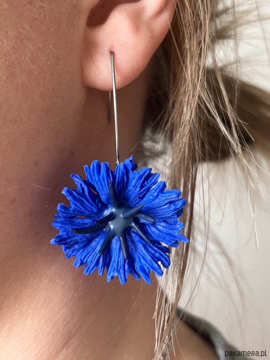Eleganckie, przyciągające wzrok kolczyki w intensywnych odcieniach błękitu, inspirowane naturalnym pięknem kwiatów. Centralnym elementem kompozycji są efektowne, trójwymiarowe kwiaty przypominające chabry — symbol delikatności i świeżości. Ich bogata struktura złożona z wielu cienkich płatków nadaje biżuterii lekkości, objętości oraz wyjątkowej głębi wizualnej.