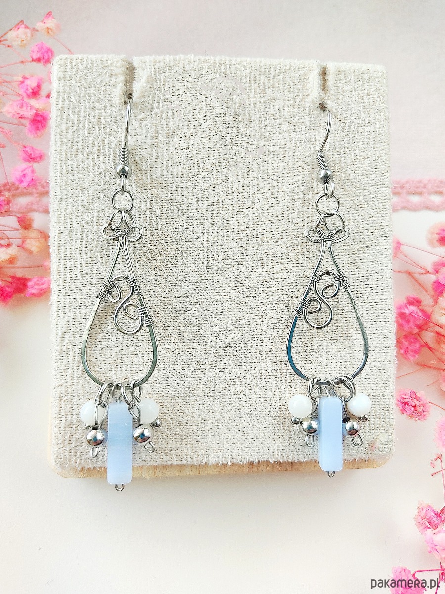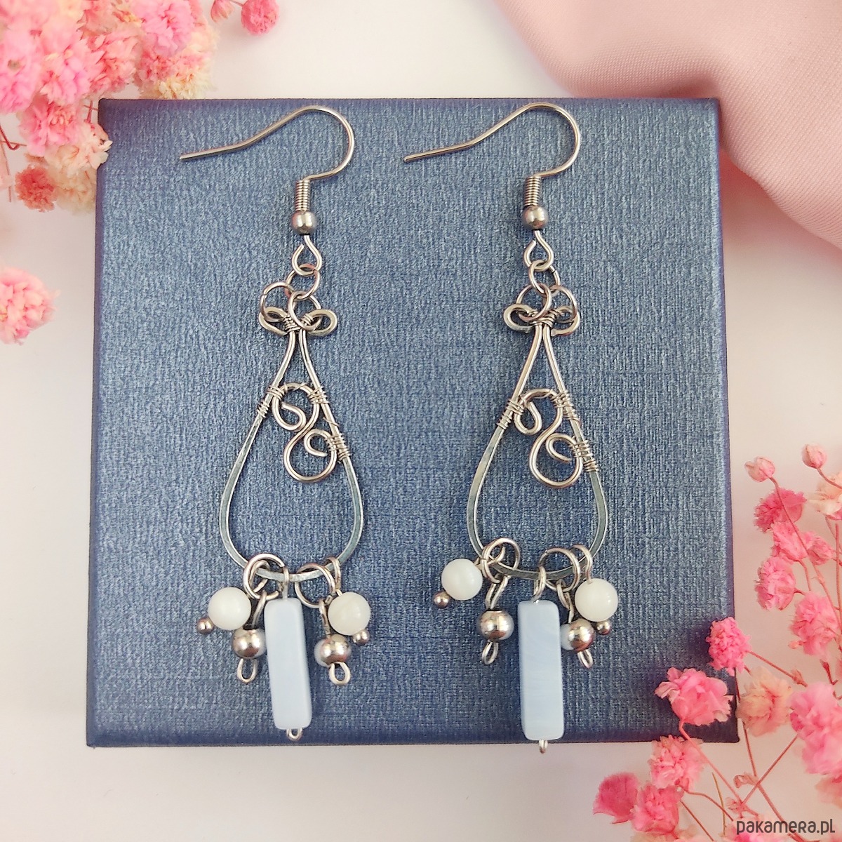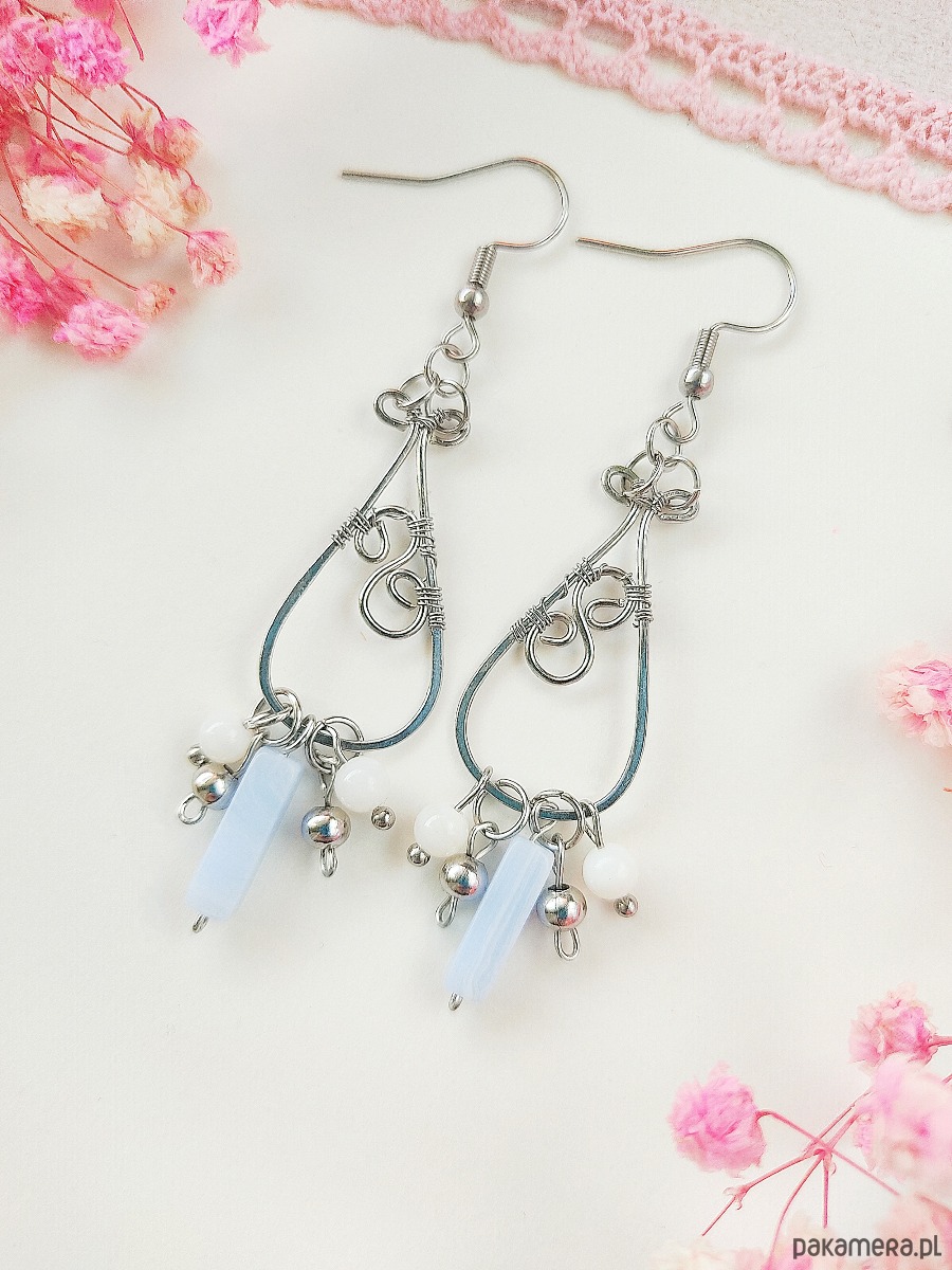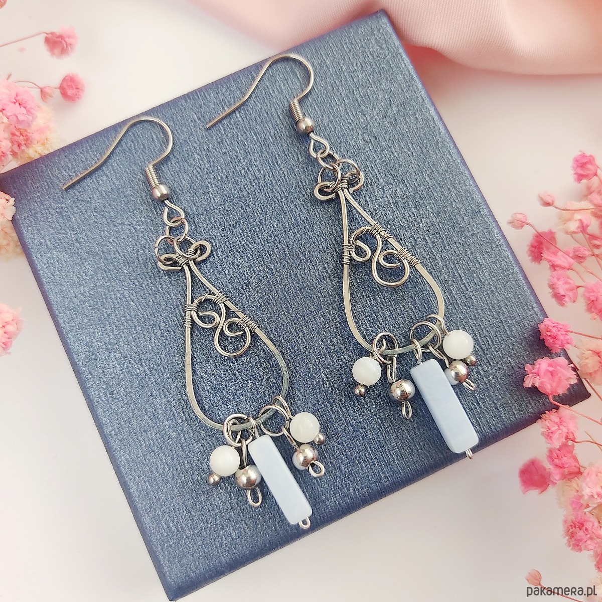 Kolczyki z chalcedonem i jadeitem wykonane ze stali chirurgicznej metodą wire wrapping to wyjątkowa propozycja dla osób, które cenią sobie elegancję połączoną z ręcznym rzemiosłem. Subtelne kamienie w delikatnych odcieniach błękitu i bieli zostały oprawione w misternie splecione druty, tworząc harmonijną kompozycję o lekkim, kobiecym charakterze. Każdy element został wykonany ręcznie, dzięki czemu kolczyki są unikatowe i wyróżniają się indywidualnym stylem.