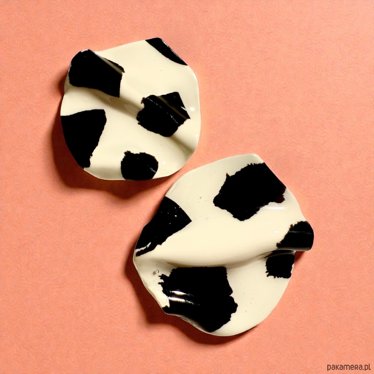 Oryginalne kolczyki wykonane ręcznie z dbałością o szczegóły z profesjonalnej glinki polimerowej, wypalane w piecu i szlifowane w domowej pracowni. Każda para kolczyków jest niepowtarzalna i wyjątkowa. Kolczyki są bardzo lekkie i wygodne, nie obciążają płatka ucha i przyciągają spojrzenia. Zapinane na sztyft ze stali chirurgicznej.