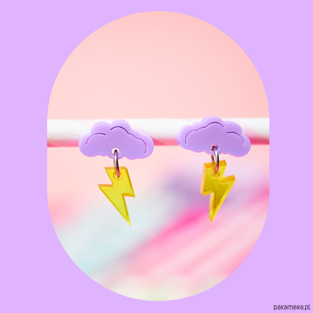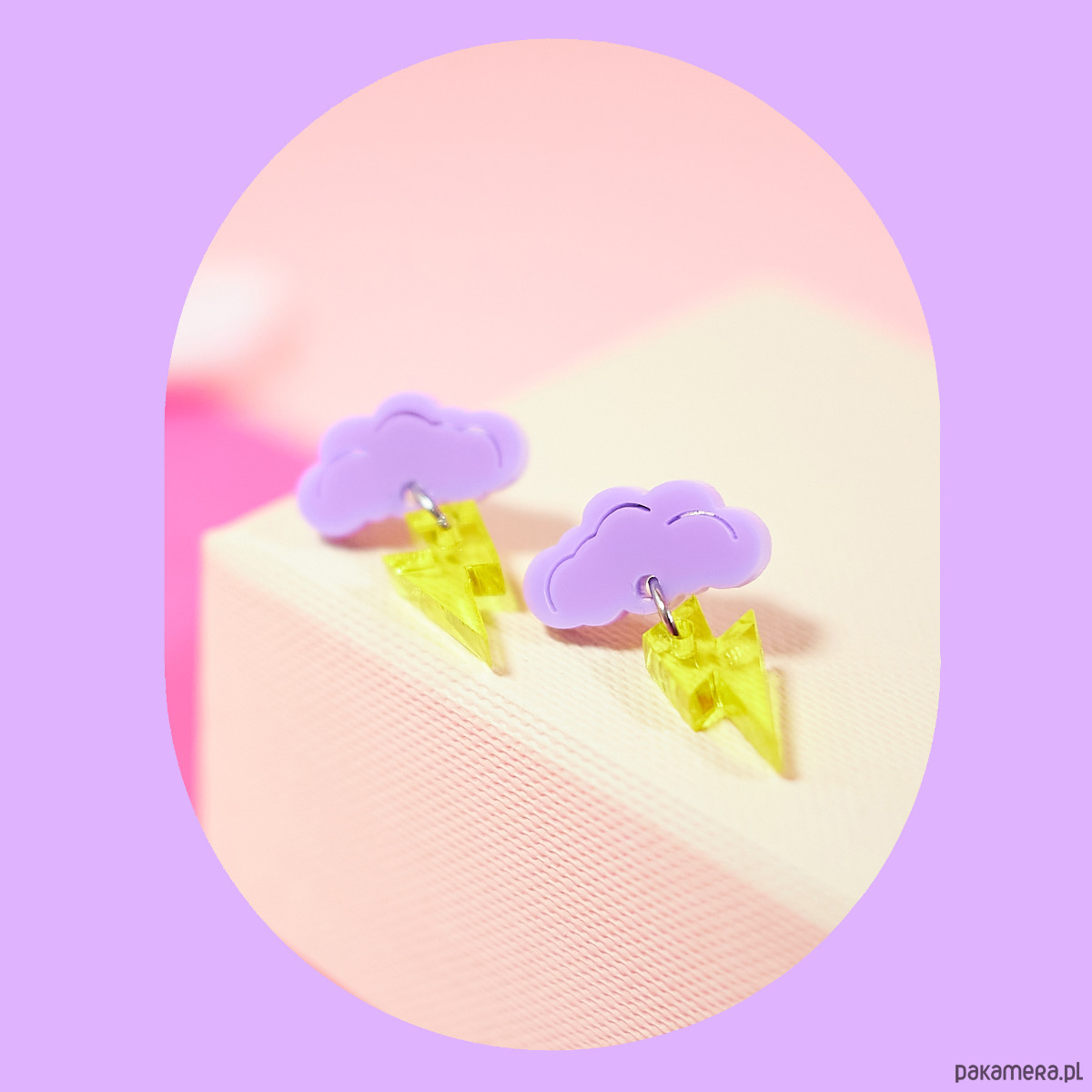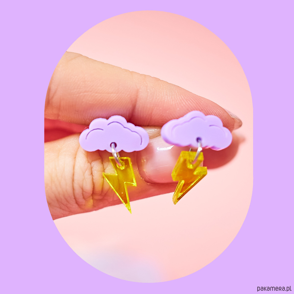 Obłoczek jest w kolorze pastelowego fioletu, błyskawica jest transparentno-żółta.