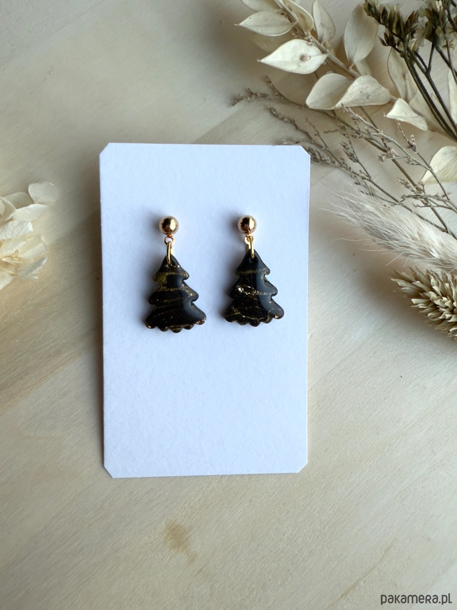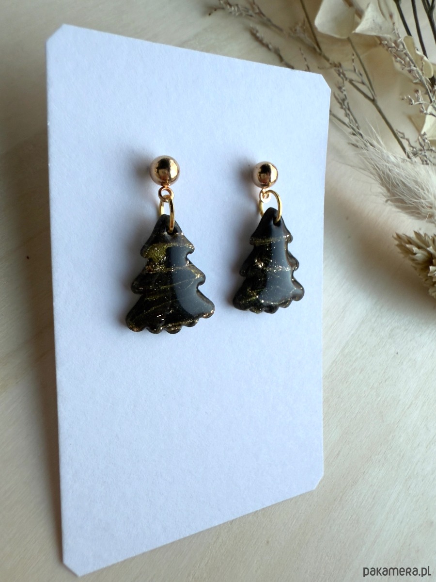 Wprowadź się w magiczny nastrój świąt z minimalistycznymi czarno‑złotymi choinkami, które pięknie połyskują przy ruchu i świetnie pasują zarówno do codziennego sweterka, jak i do małej czarnej. Delikatne złote drobinki w masie polimerowej oraz błyszczące, złote sztyfty tworzą spójny, elegancki komplet, który mimo wyrazistego kształtu pozostaje lekki i komfortowy w noszeniu.