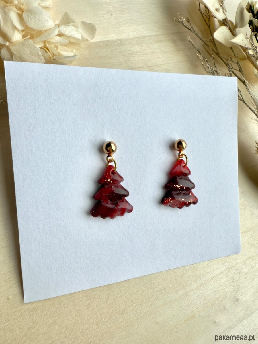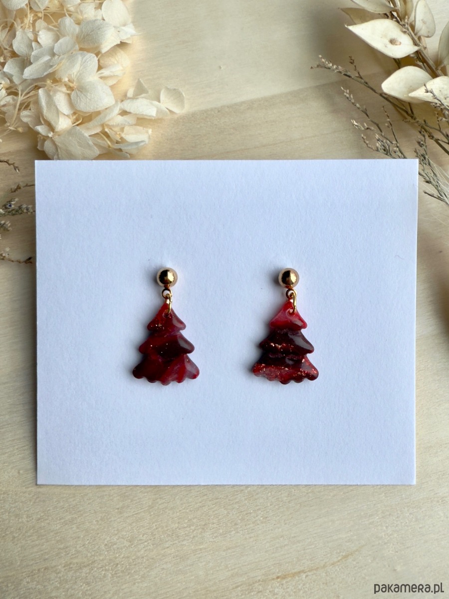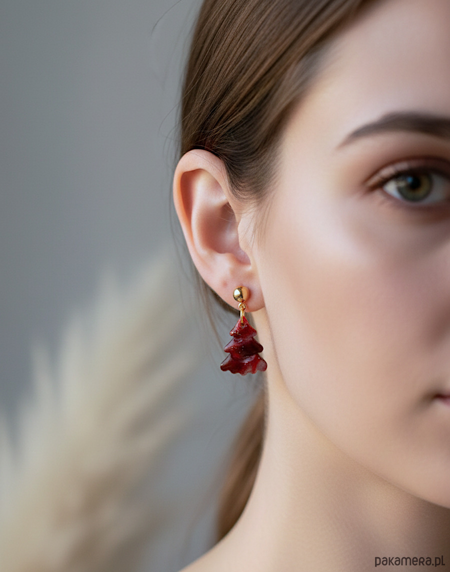 Głęboki rubinowy odcień z transparentnymi przejściami i błyszczącymi drobinkami przywodzi na myśl bombki i światełka choinkowe, dzięki czemu kolczyki pięknie podkreślają świąteczne stylizacje – od miękkiego swetra po elegancką sukienkę. Lekka, przestrzenna forma choinek delikatnie kołysze się przy ruchu głowy, a złote kulki‑sztyfty i kółeczka dodają całości eleganckiego wykończenia, pozostając wygodnymi nawet przy całodziennym noszeniu.