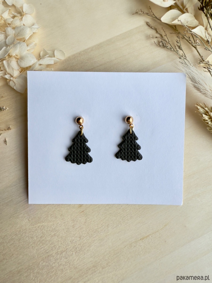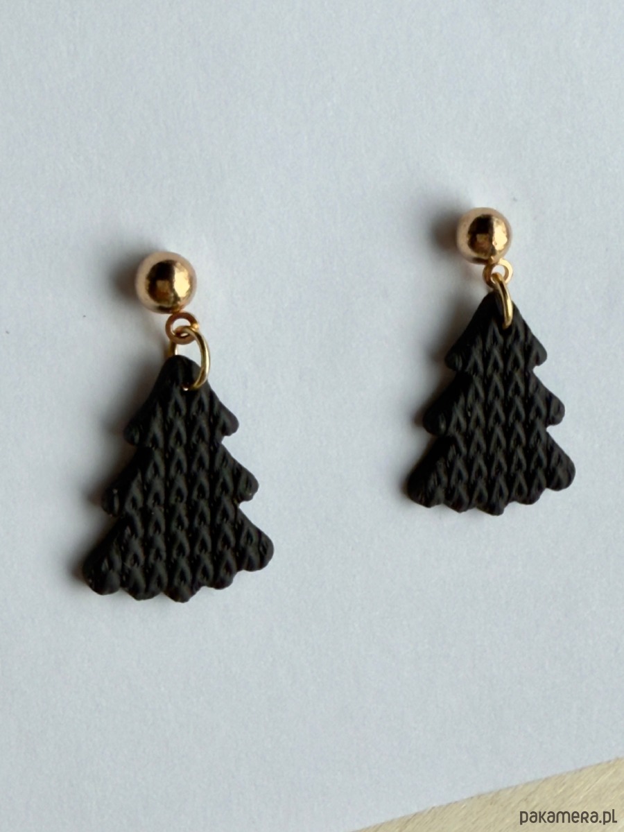 Minimalistyczne kolczyki w kształcie choinek wykonane z lekkiego, czarnego tworzywa o subtelnej, „sweterkowej” fakturze.