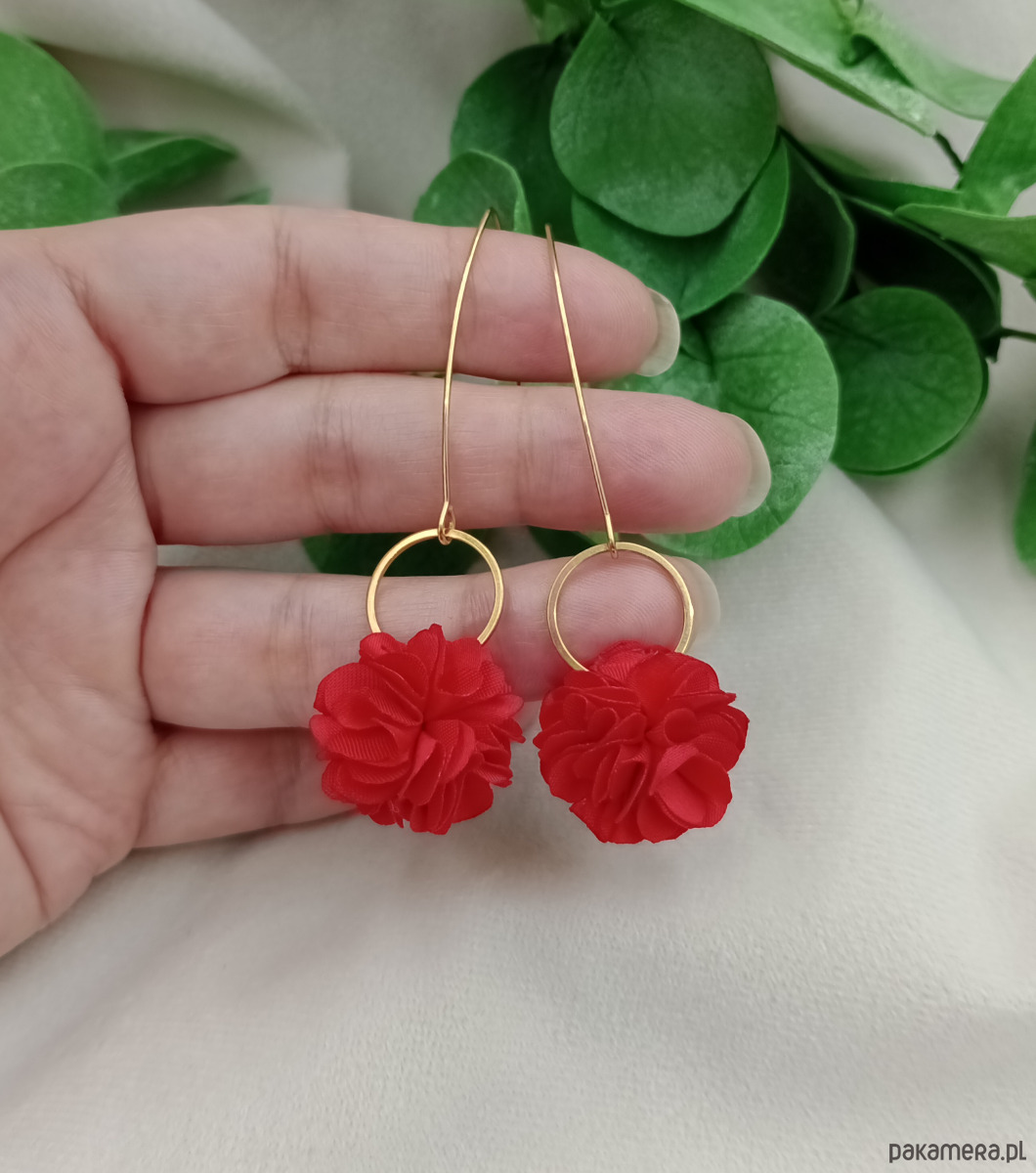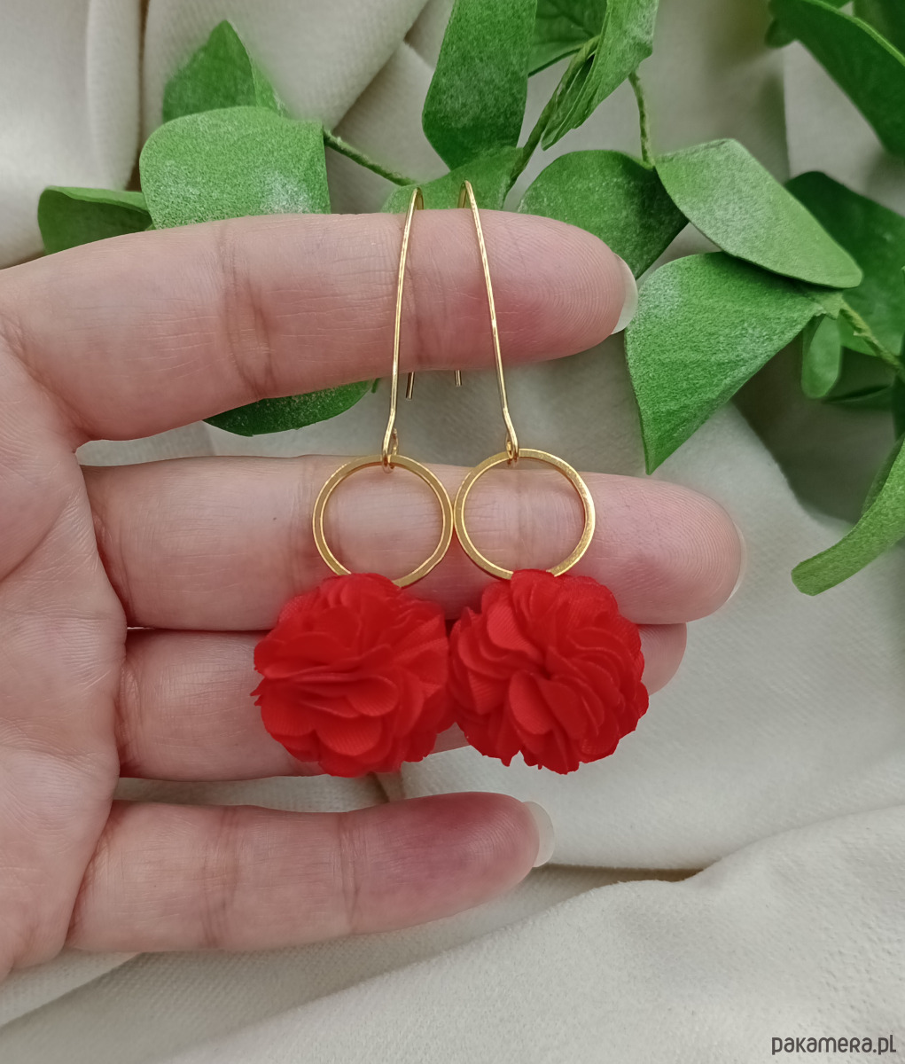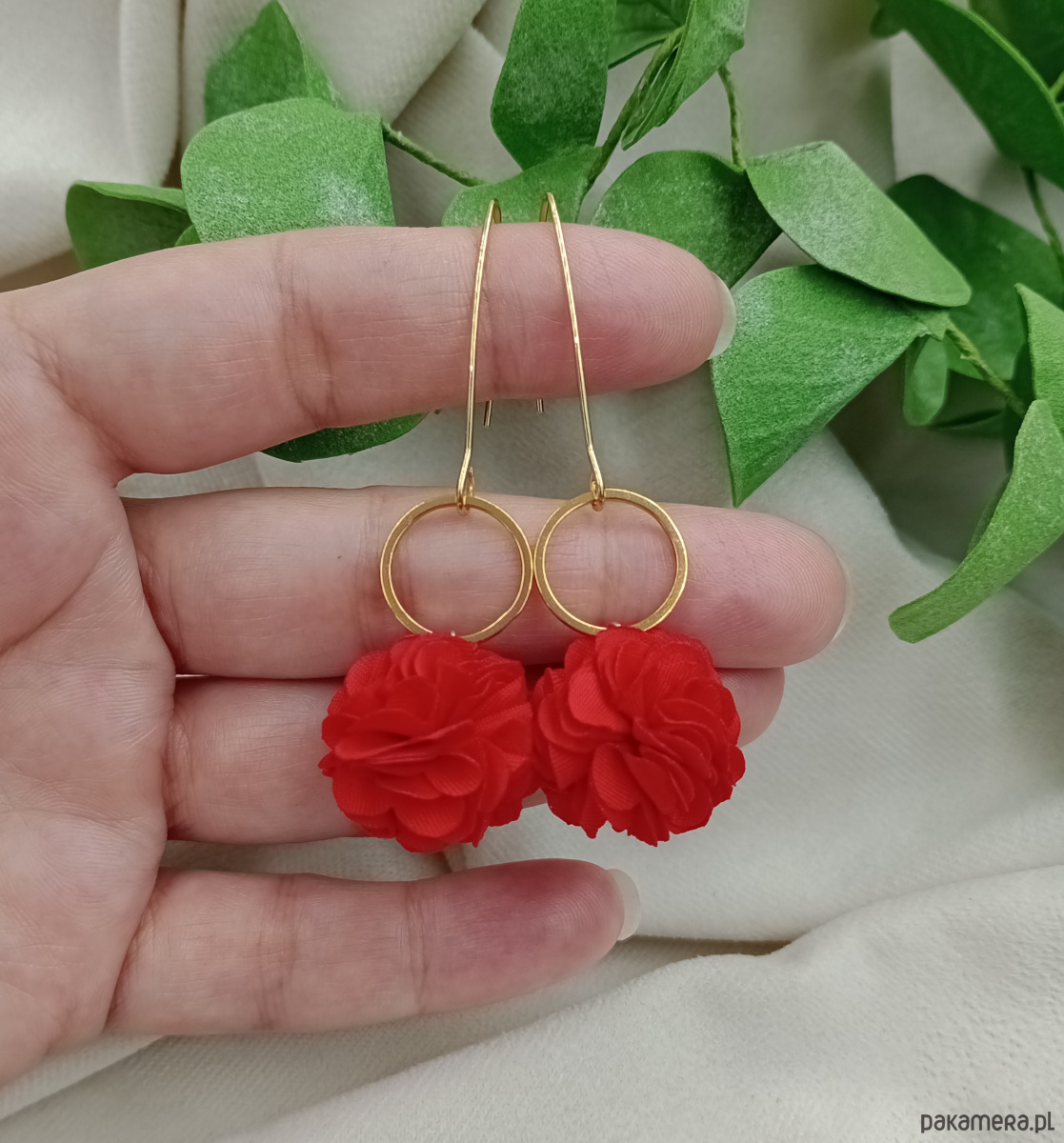 Kolczyki czerwone kwiaty. Długie, wąskie - pięknie wysmuklają owal twarzy.