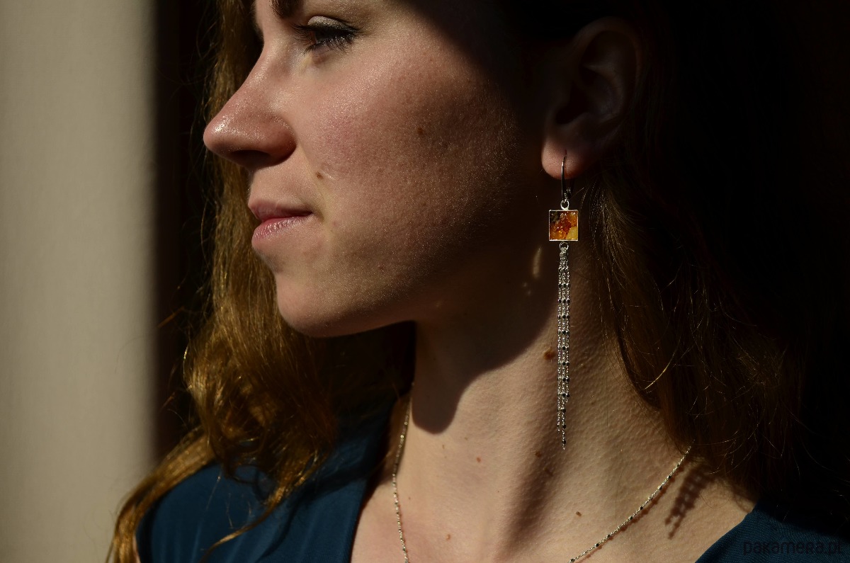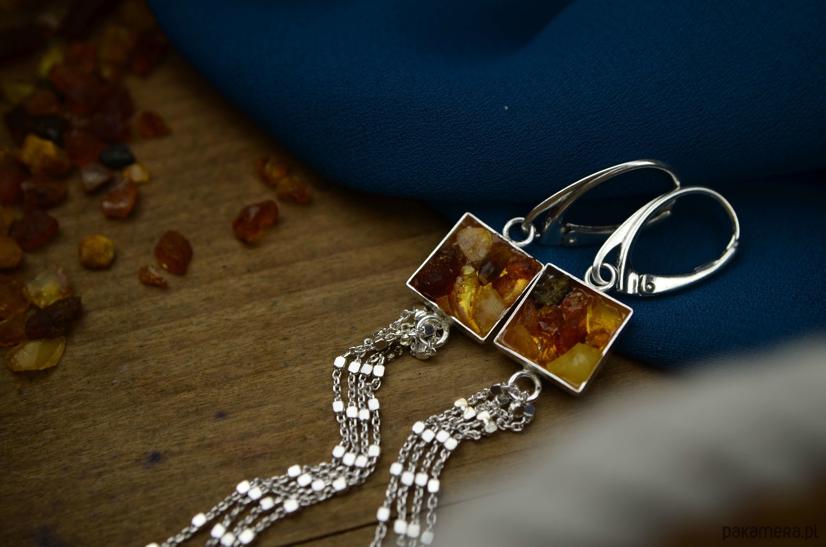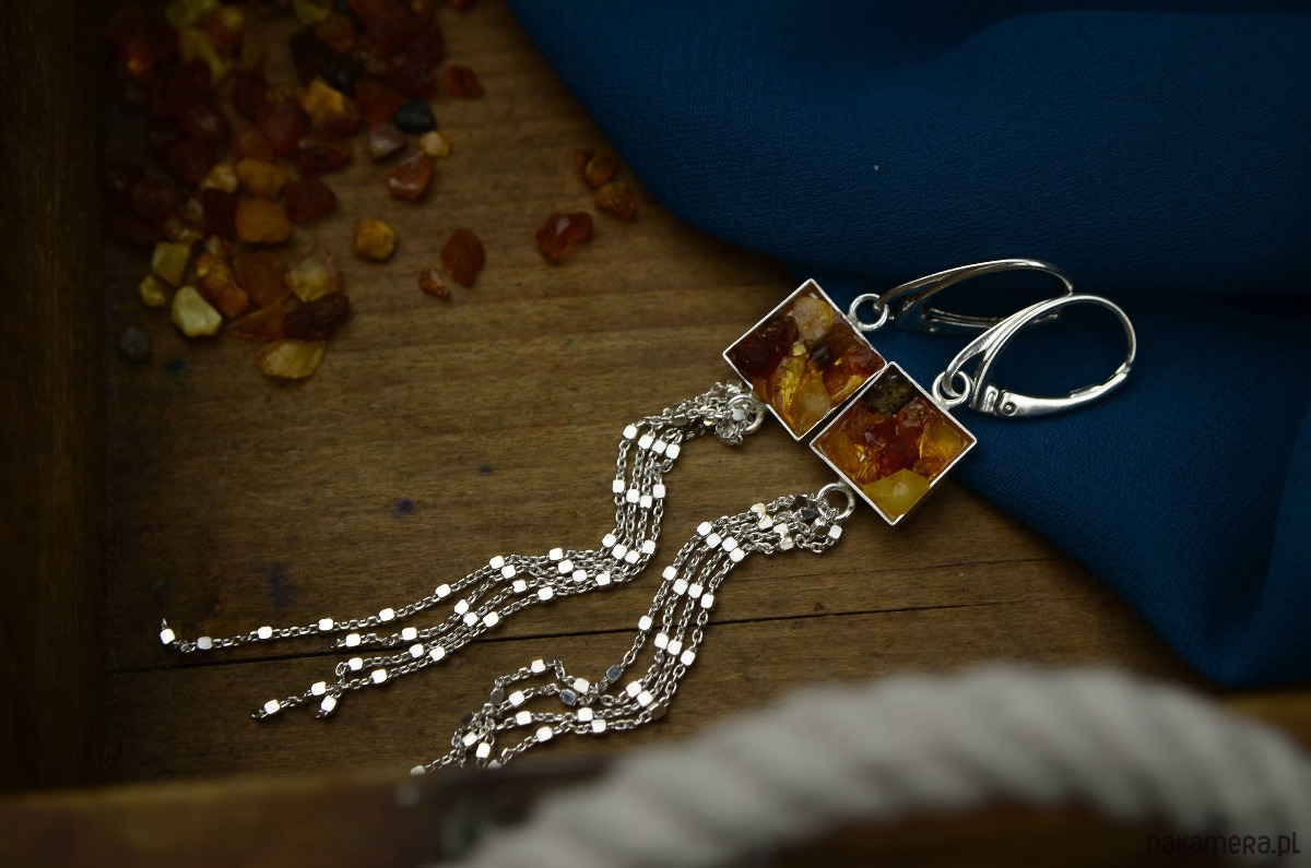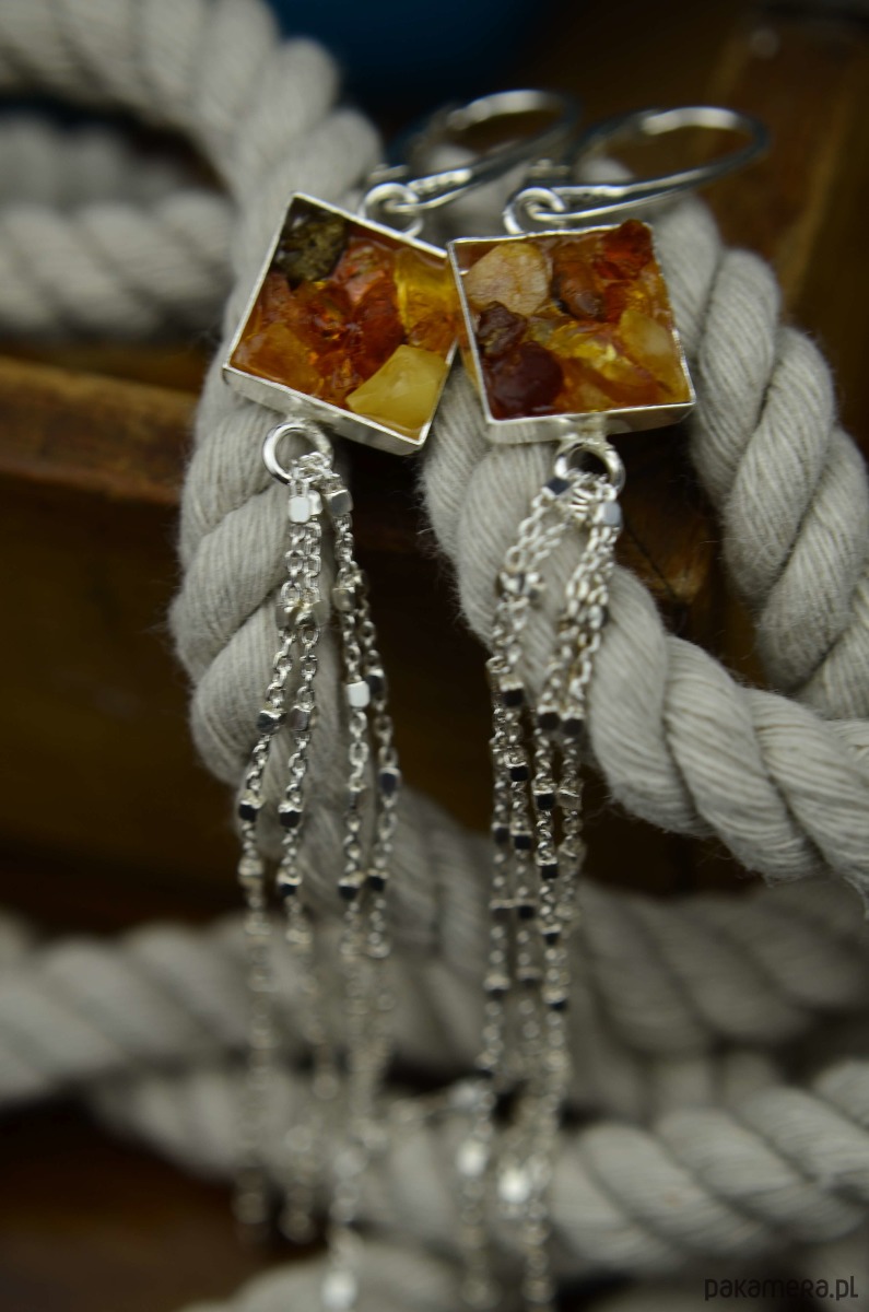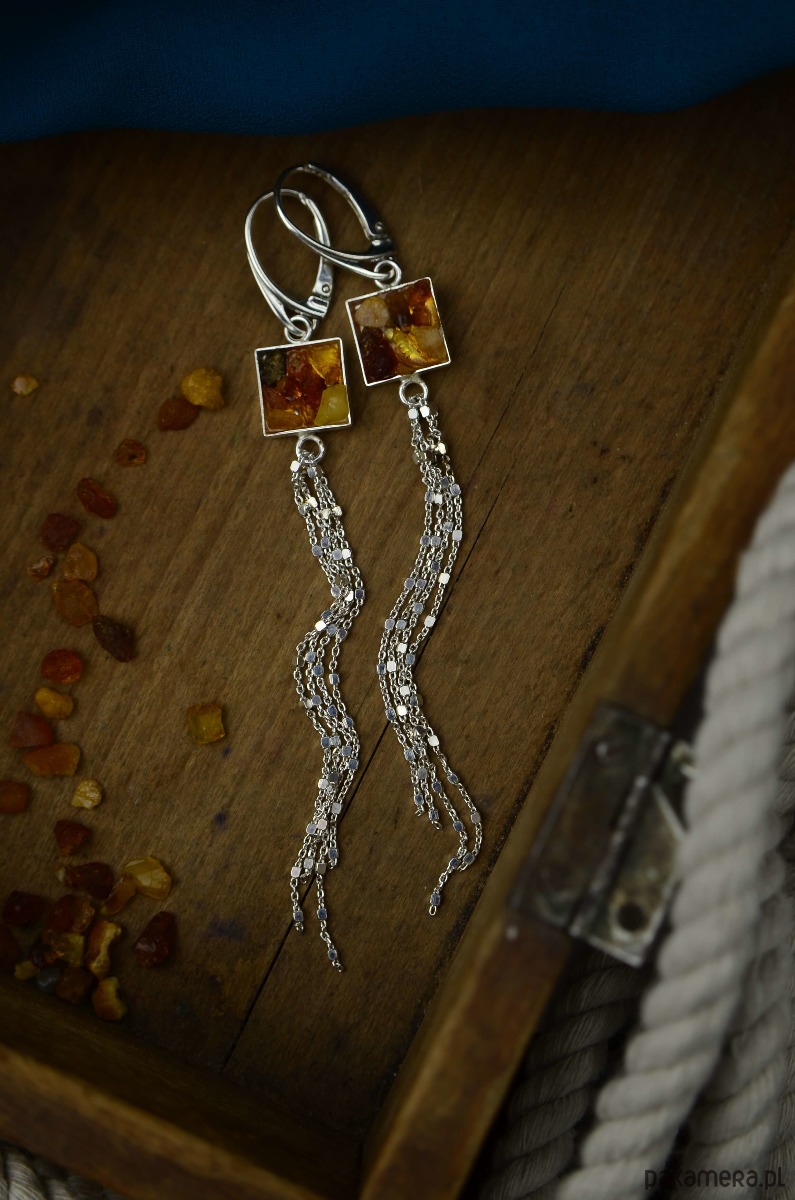 Bardzo długie kolczyki wykonane ze srebra próby 925 i kawałków surowego bursztynu bałtyckiego. Naturalne, zebrane z plaży bursztynki zamknęłam w srebrnym kwadracie o boku 1 cm. Kolczyki mają długie chwosty z ozdobnego srebrnego łańcuszka o różnych długościach (fantastycznie układa się podczas noszenia!). Bursztyny w kolczykach mają różne ciepłe odcienie: od żółtego, poprzez pomarańczowy do brązu. Z uwagi na różne kształty i kolory bursztynu każda sztuka biżuterii różni się delikatnie od siebie.