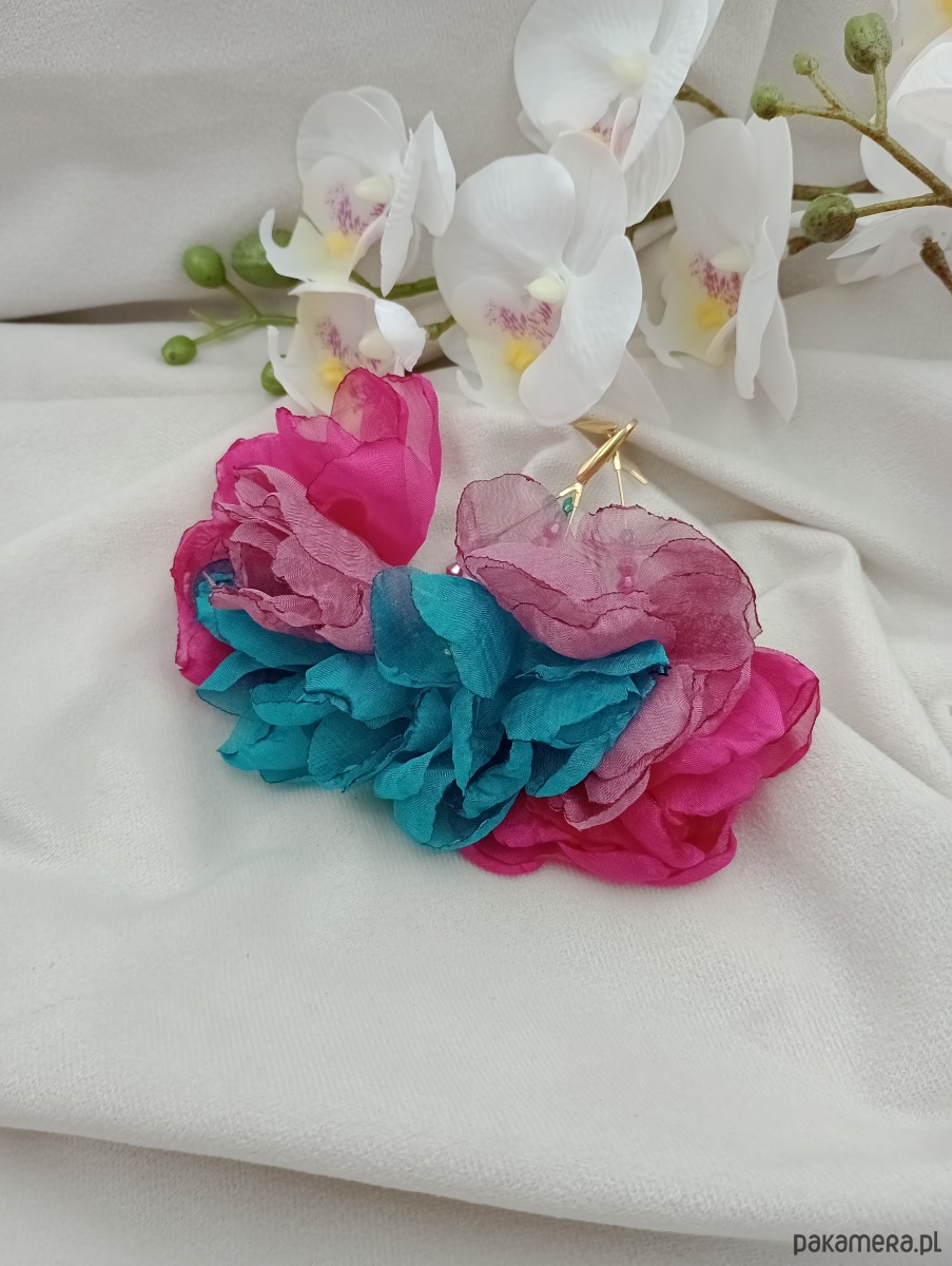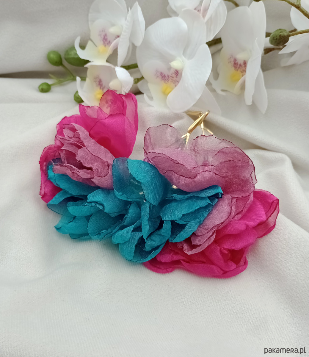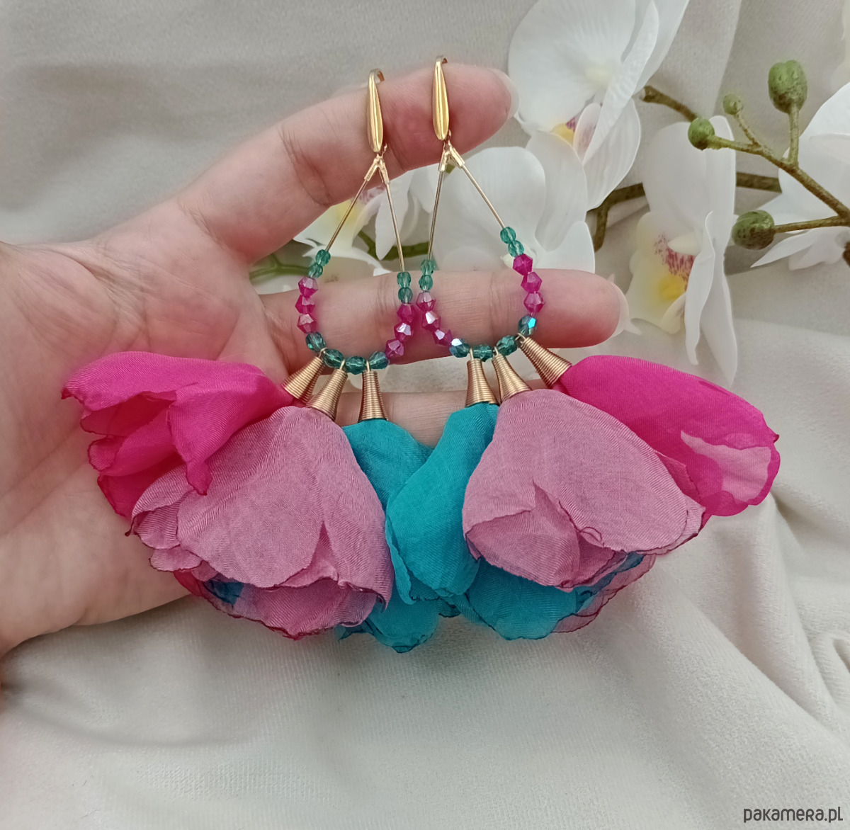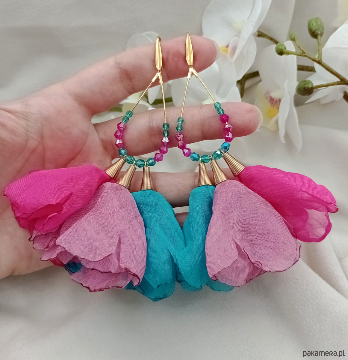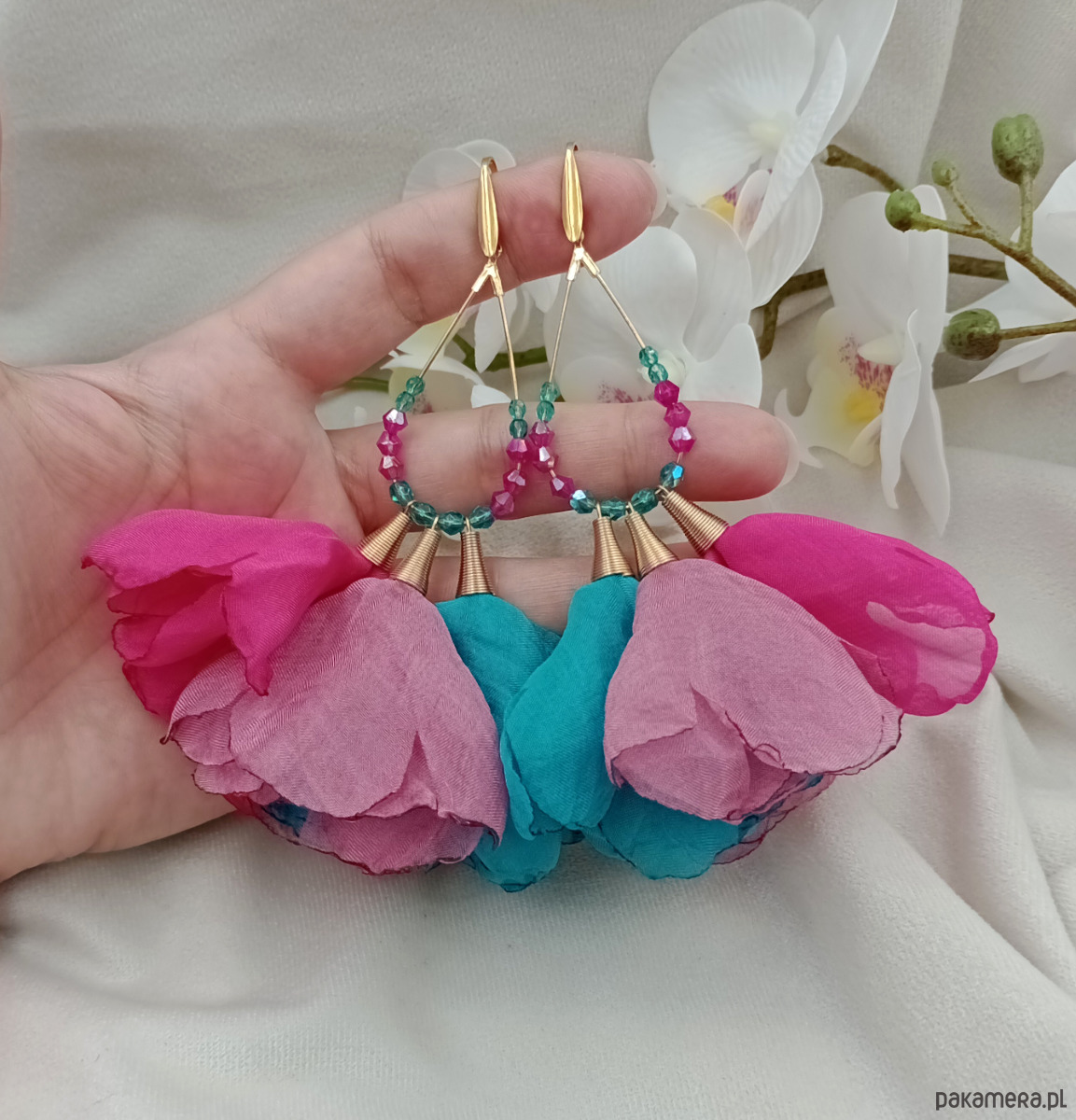 Kolczyki chwosty duże kwiaty, kolczyki kwiaty fuksja turkus