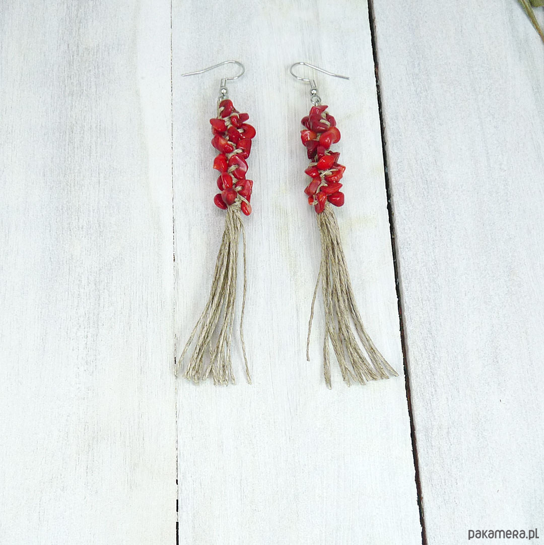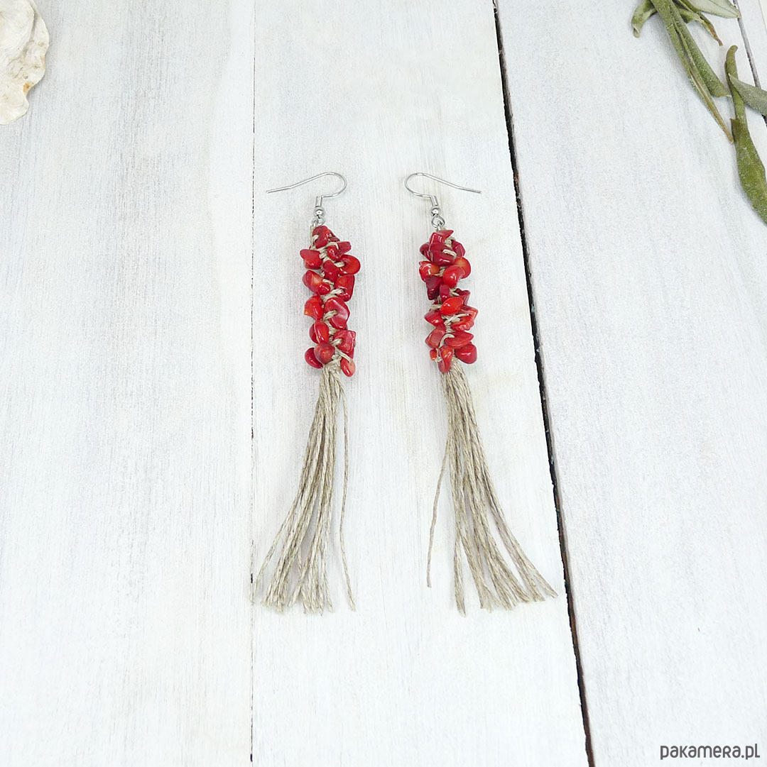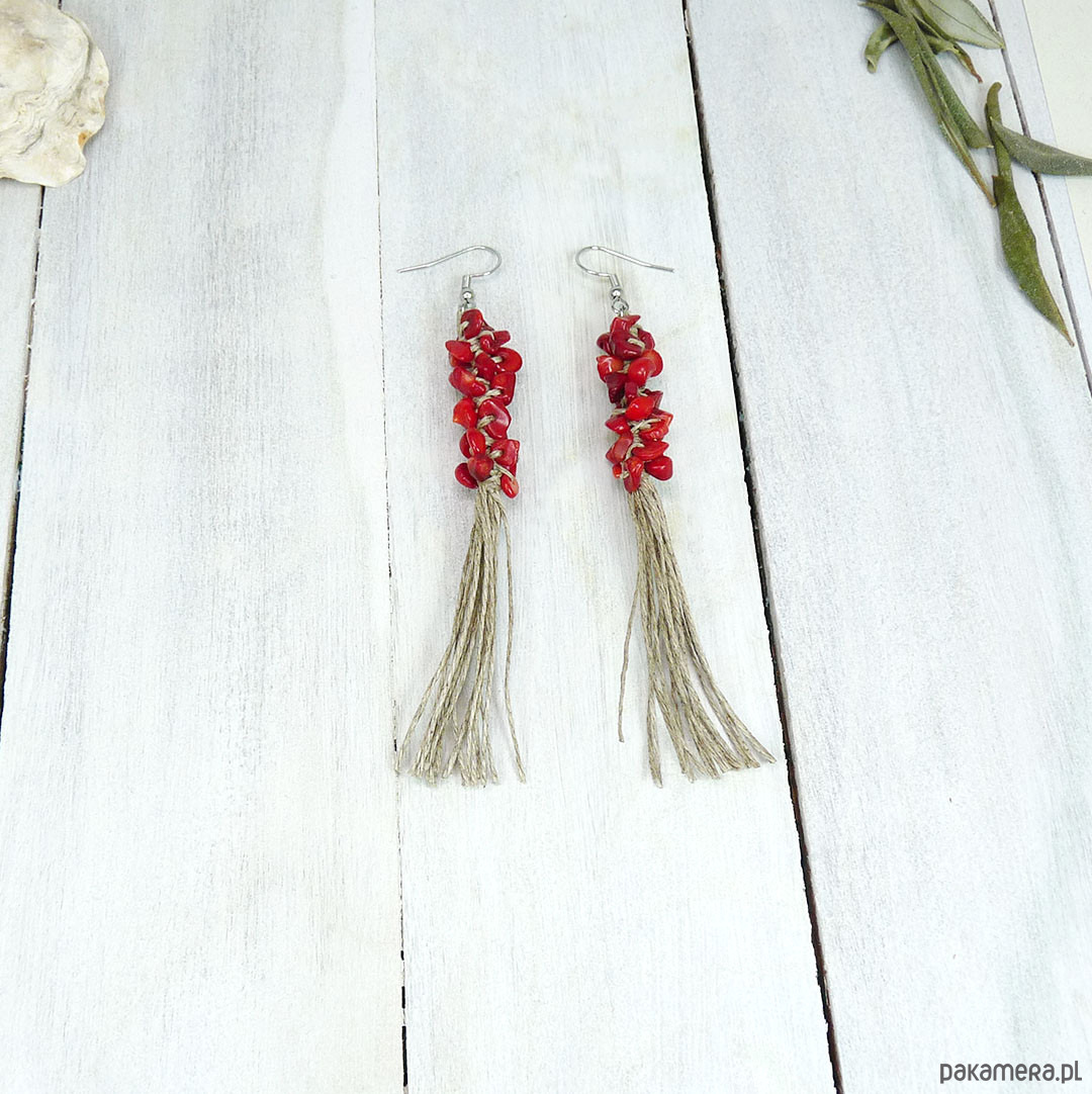 koral czerwony nieregularny, len naturalny, stal szlachetna kolor srebrny