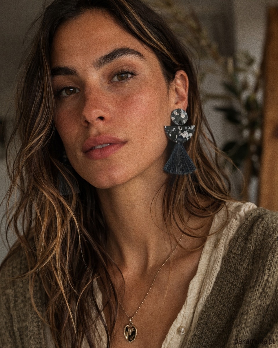 Kolczyki wykonane są ze skóry w odcieniach czerni, szarości i bieli z naturalnym wzorem przypominającym rozpryski farby. Całość uzupełnia miękki, szary chwost, który dodaje lekkości, ruchu i subtelnej elegancji. Połączenie geometrycznych form z fakturą skóry tworzy wyjątkowy, przyciągający uwagę dodatek.