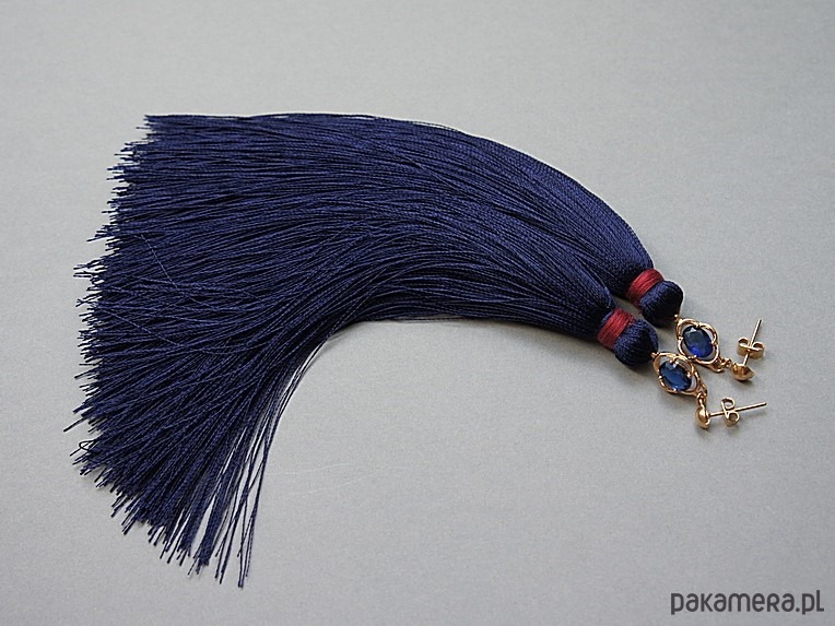 Bardzo długie kolczyki w kolorze granatowymi i bordowym wykonane z satynowych chwostów, łączników z cyrkoniami oraz elementów metalowych w kolorze złotym. Długość kolczyków 14,3cm. Biżuteria ozdobnie zapakowana.