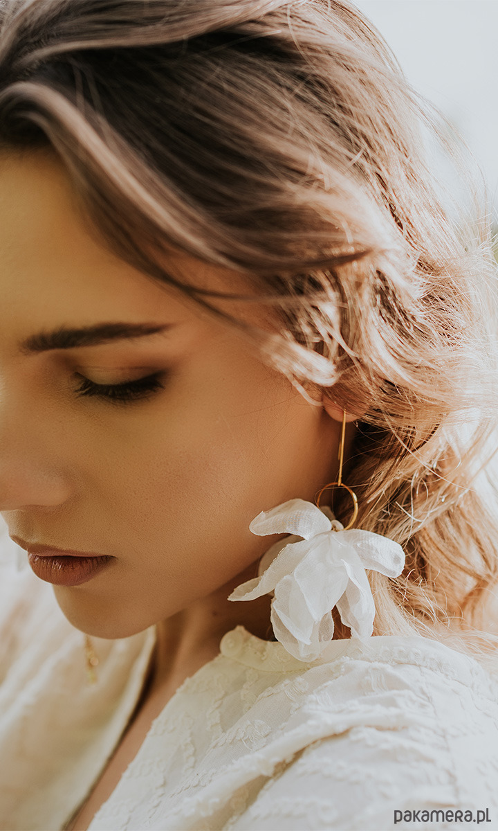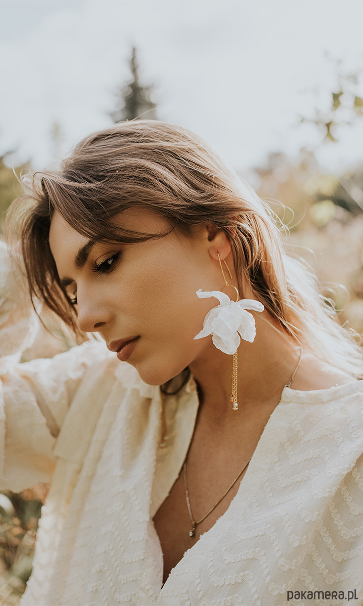 Modelka prezentuje kolczyki kwiaty długie peonie – Julia