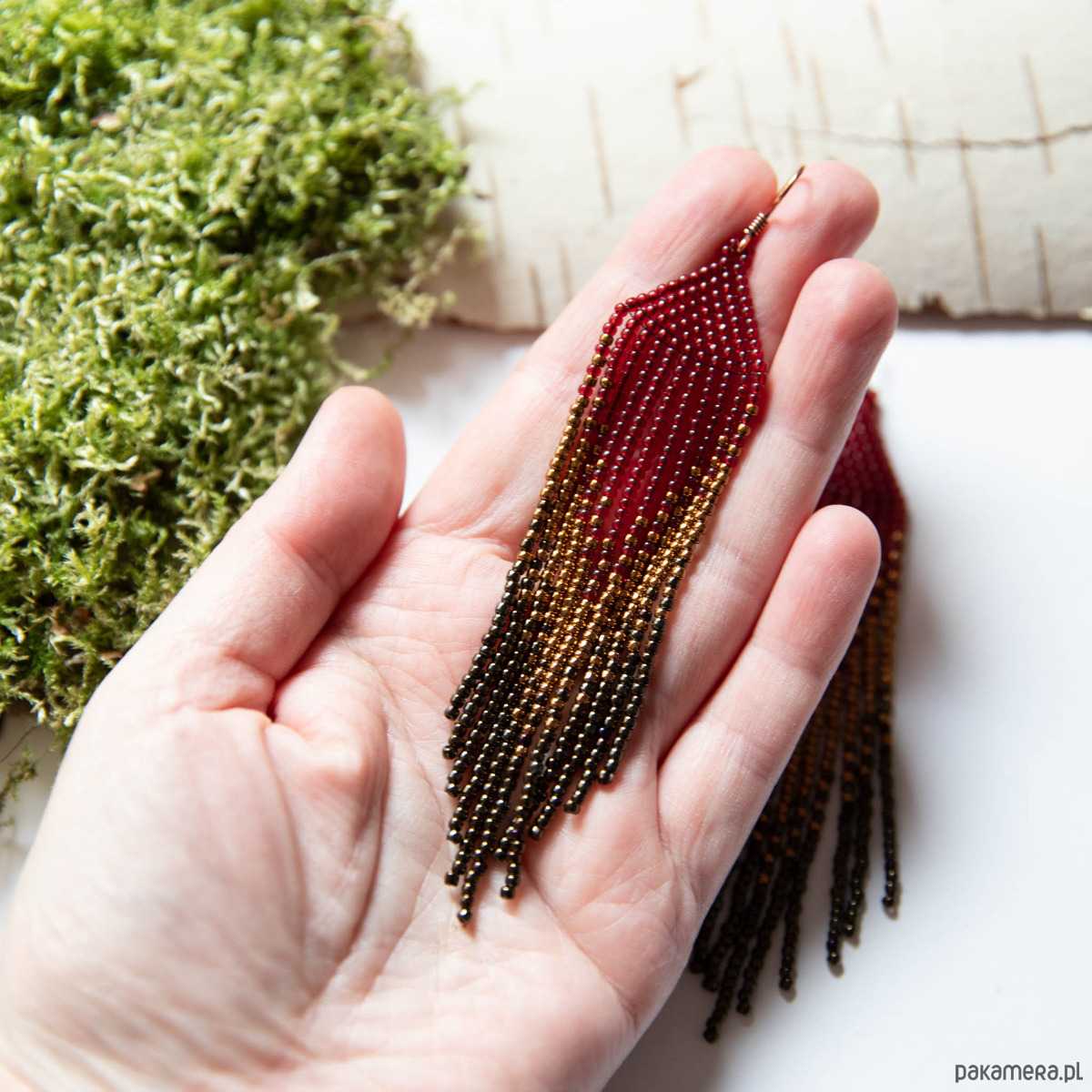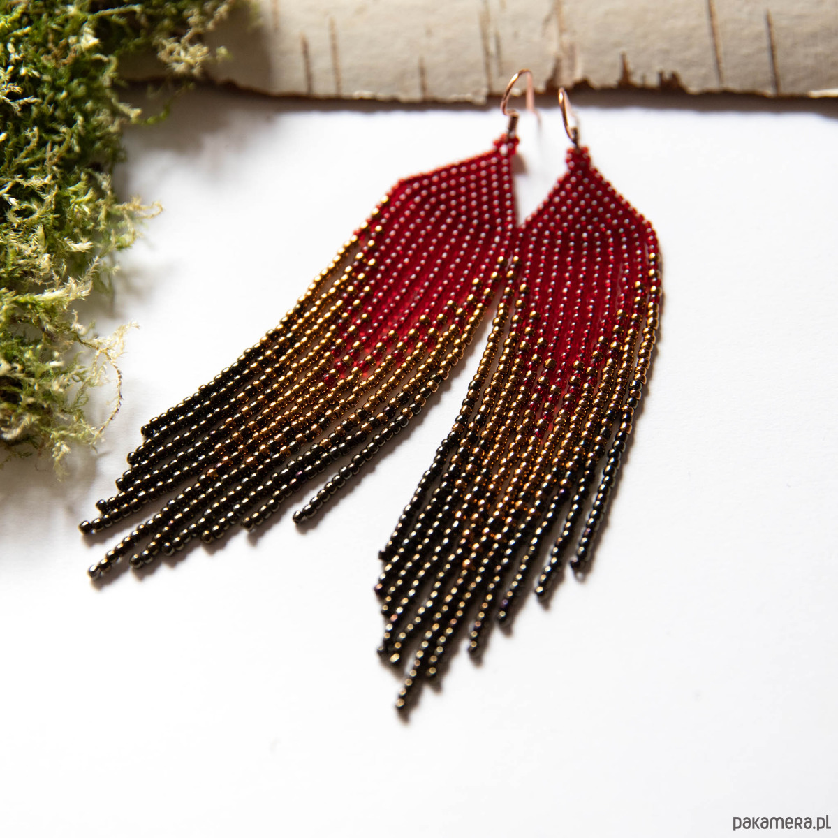Wykonane z japońskich szklanych koralików. Bigle miedziane (w tej chwili wyprzedane), możliwość wymiany na antyalergiczne, srebrne lub ze srebra pozłacanego, proszę zostawić uwagę przy zamówieniu. Wymiary kolczyka: 12cm/2,5cm.