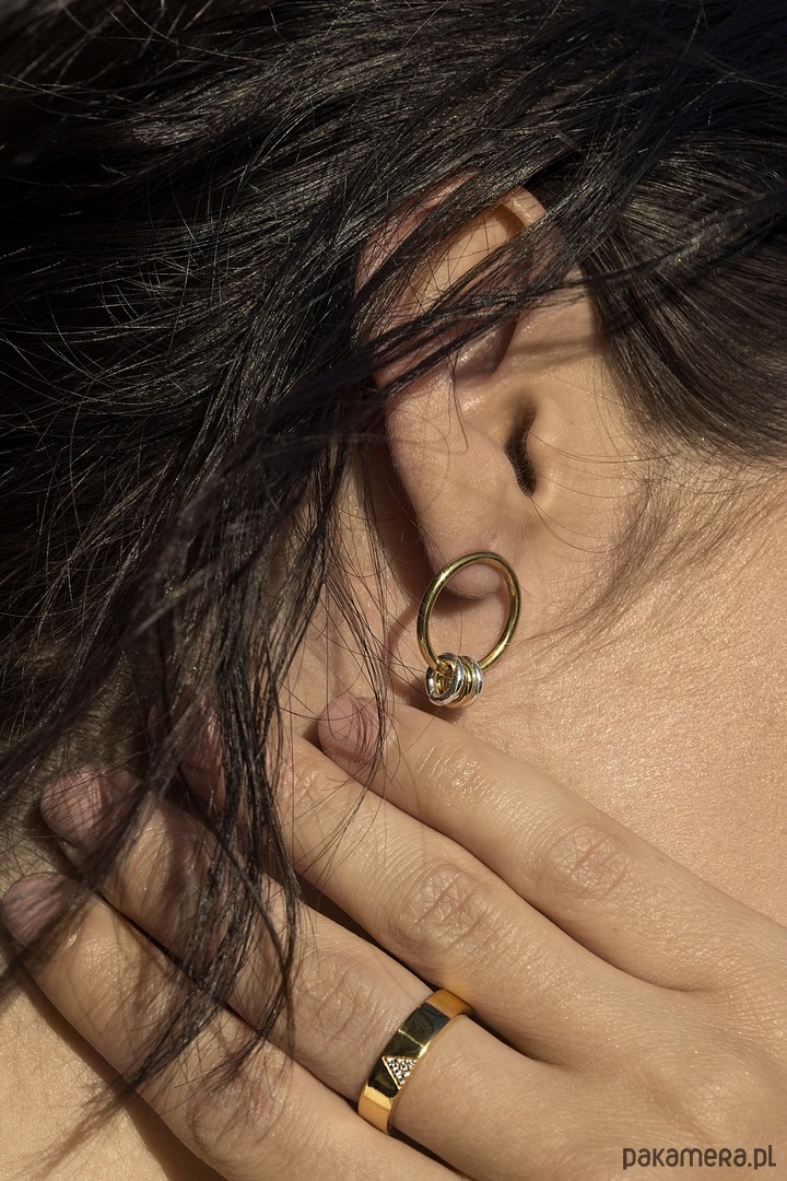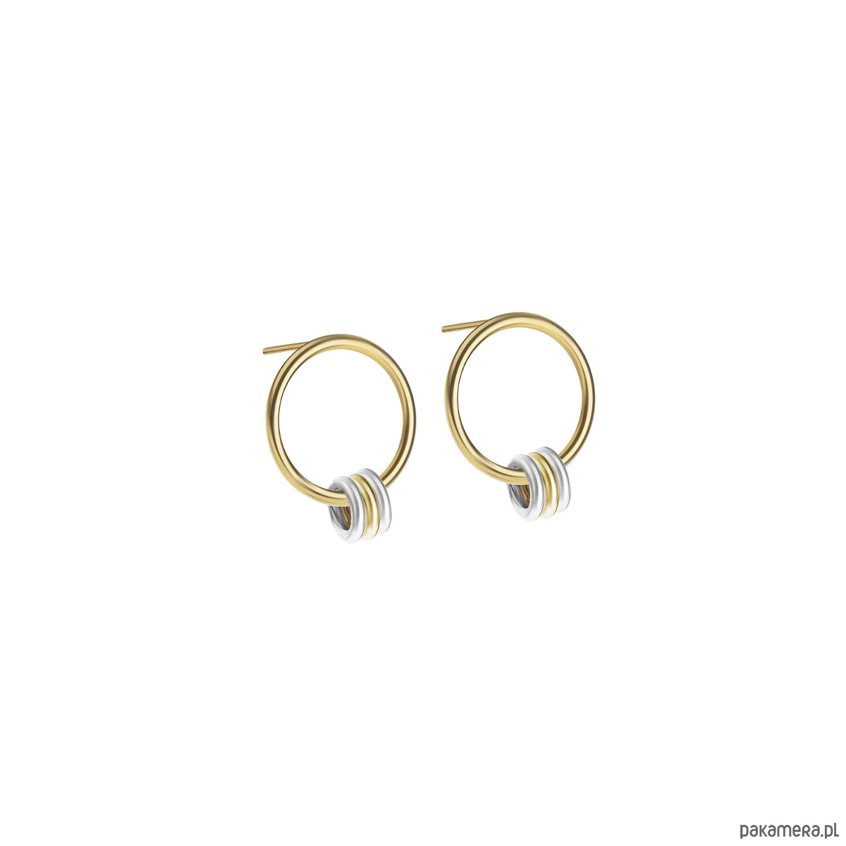 Minimalistyczne złocone kolczyki koła ozdobione trzema małymi srebrno-złoconymi kółeczkami.