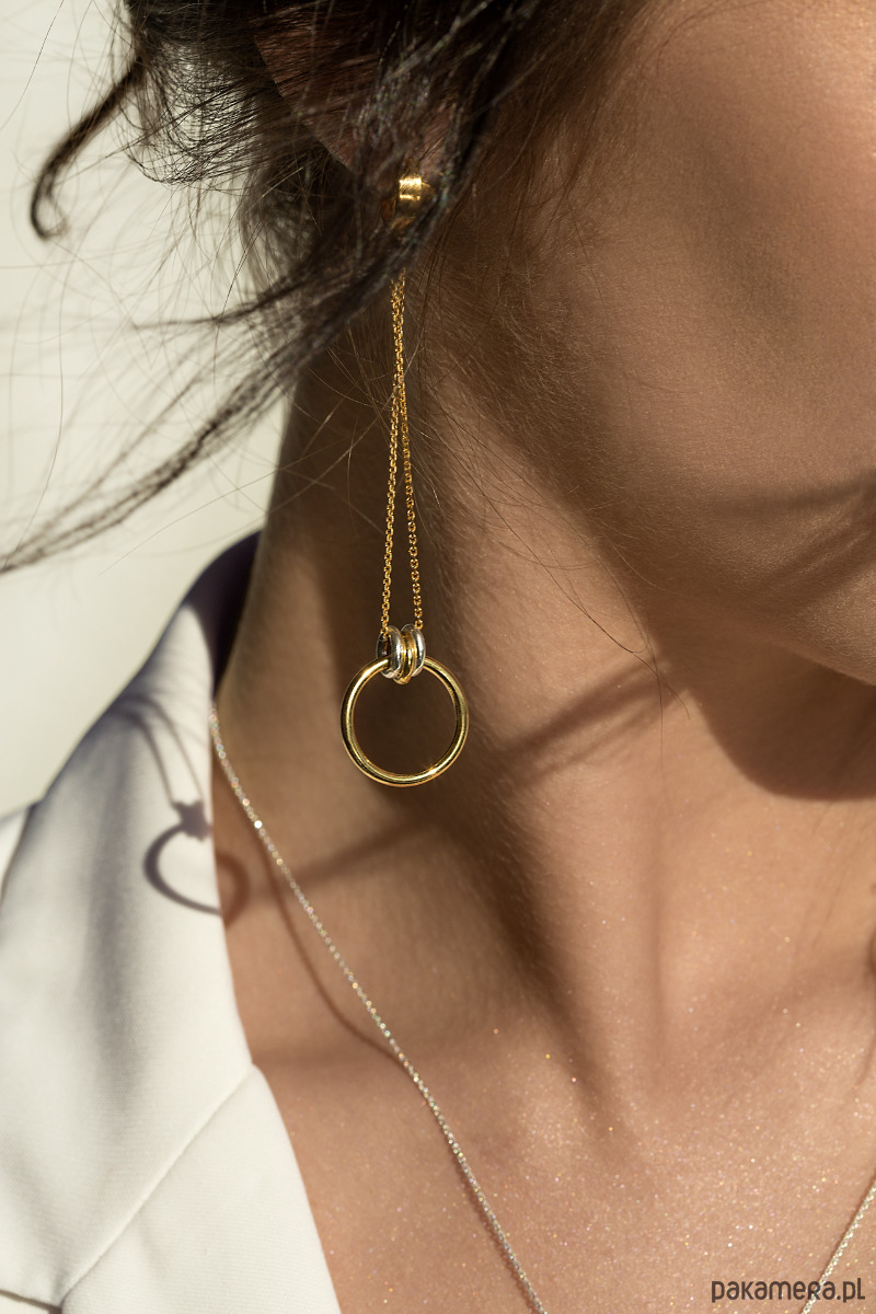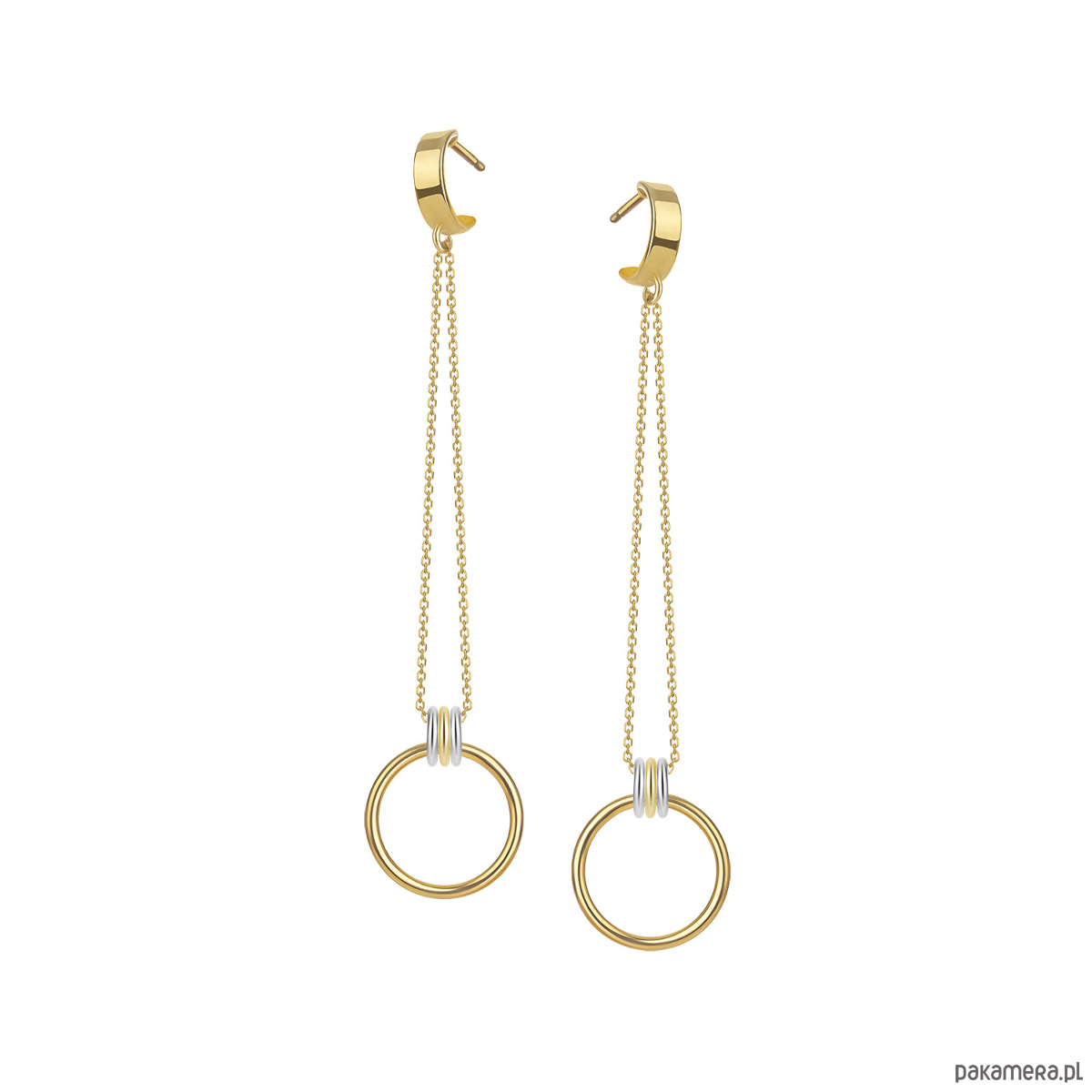 Eleganckie złocone kolczyki koła ozdobione trzema małymi srebrno-złoconymi kółeczkami.