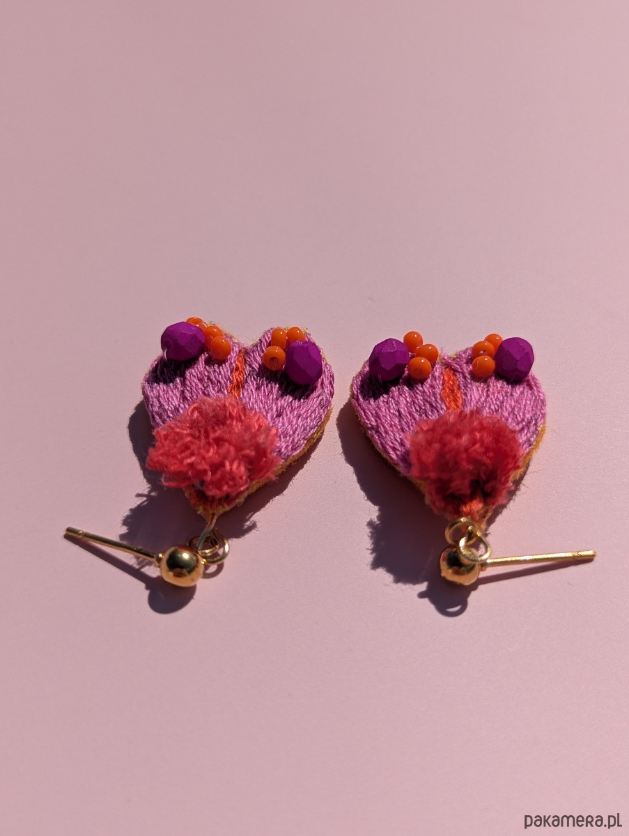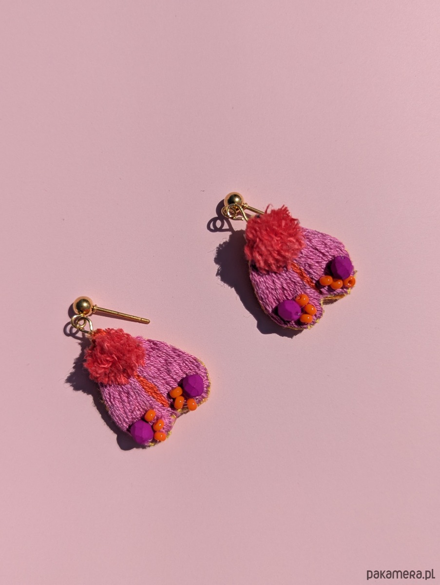 Kolczyki zostały wyhaftowane na bawełnianym materiale, bawełnianymi nićmi i ozdobione koralikami. Tył wykończony jest filcem.