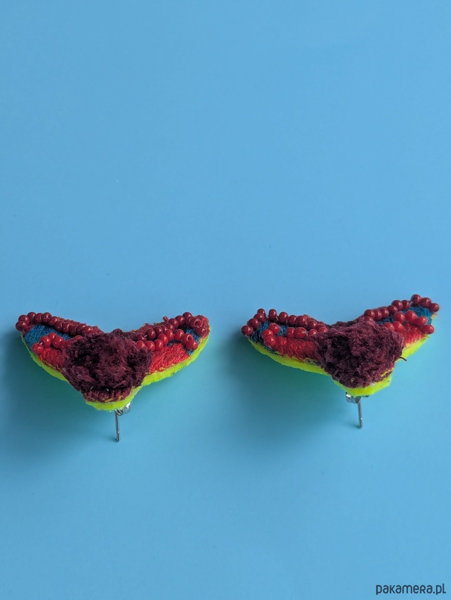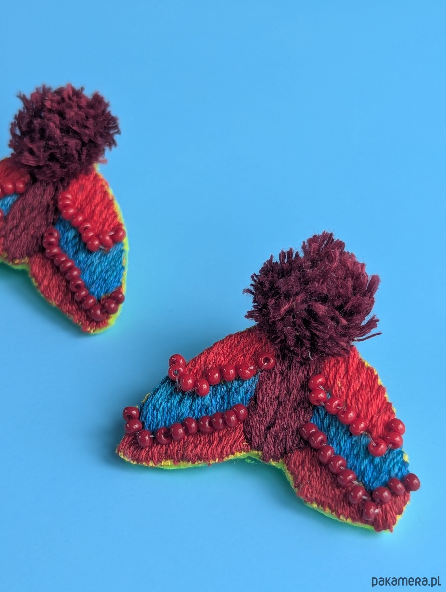 Kolczyki wyhaftowane są na bawełnianej tkaninie bawełnianymi nićmi i ozdobione szklanymi koralikami. Tył wykończony jest skórą pochodzącą z upcyklingu.