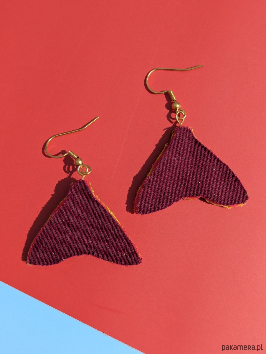 Kolczyki haftowane są bawełnianymi nićmi na bawełnianym materiale, tył również wykończony jest bawełnianym materiałem. Ozdobione są szklanymi koralikami i umieszczone na antyalergicznych biglach ze stali chirurgicznej w złotym kolorze.