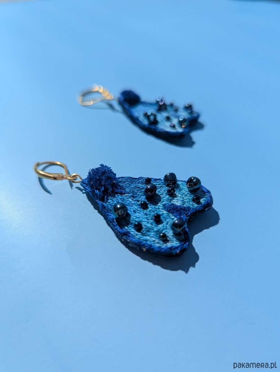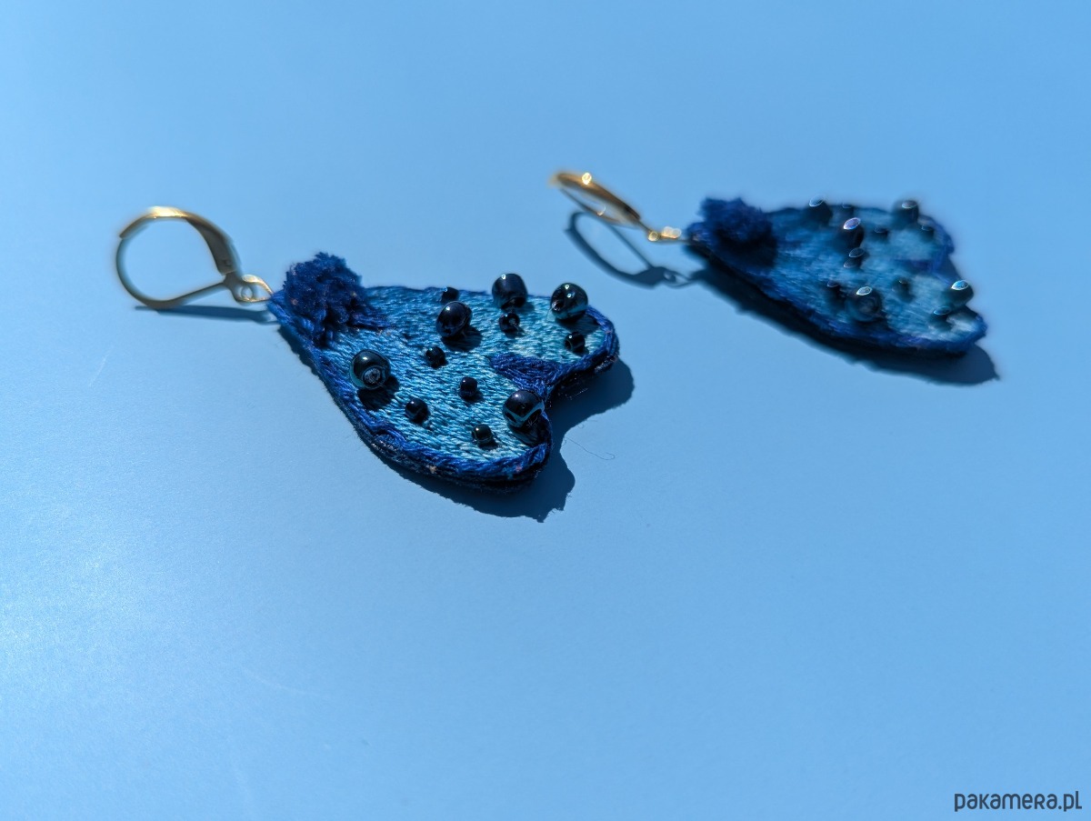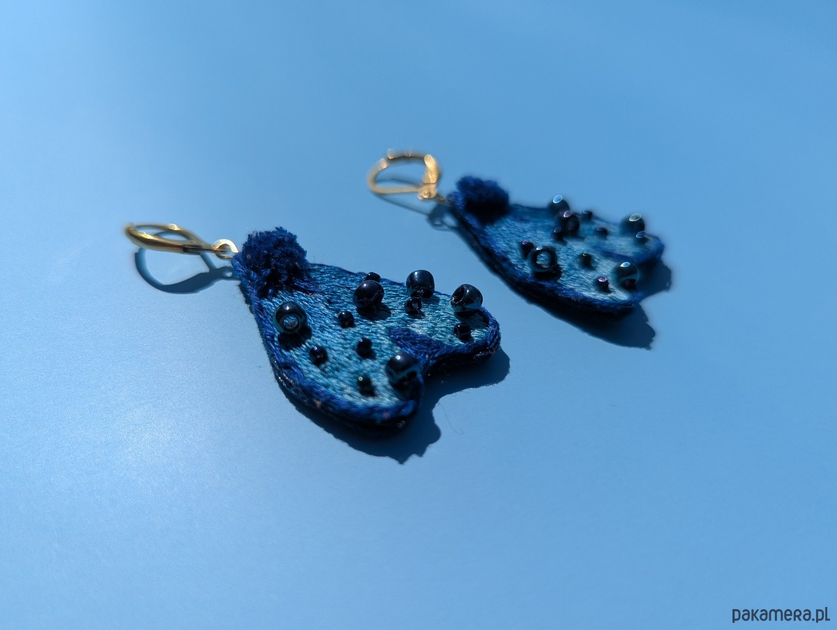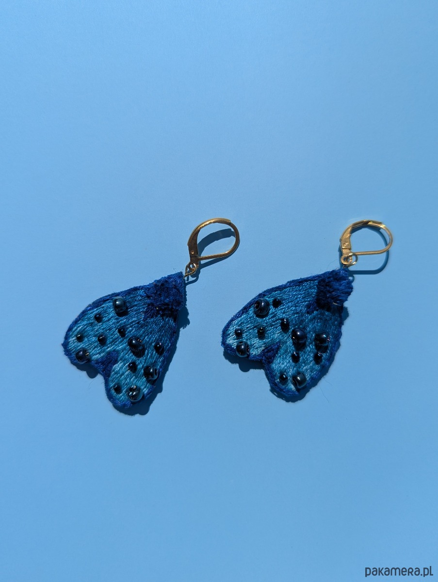 Kolczyki wykonane są z bawełnianego materiału, haftowane bawełnianymi nićmi i ozdobione szklanymi koralikami. Tył wykończony jest filcem.