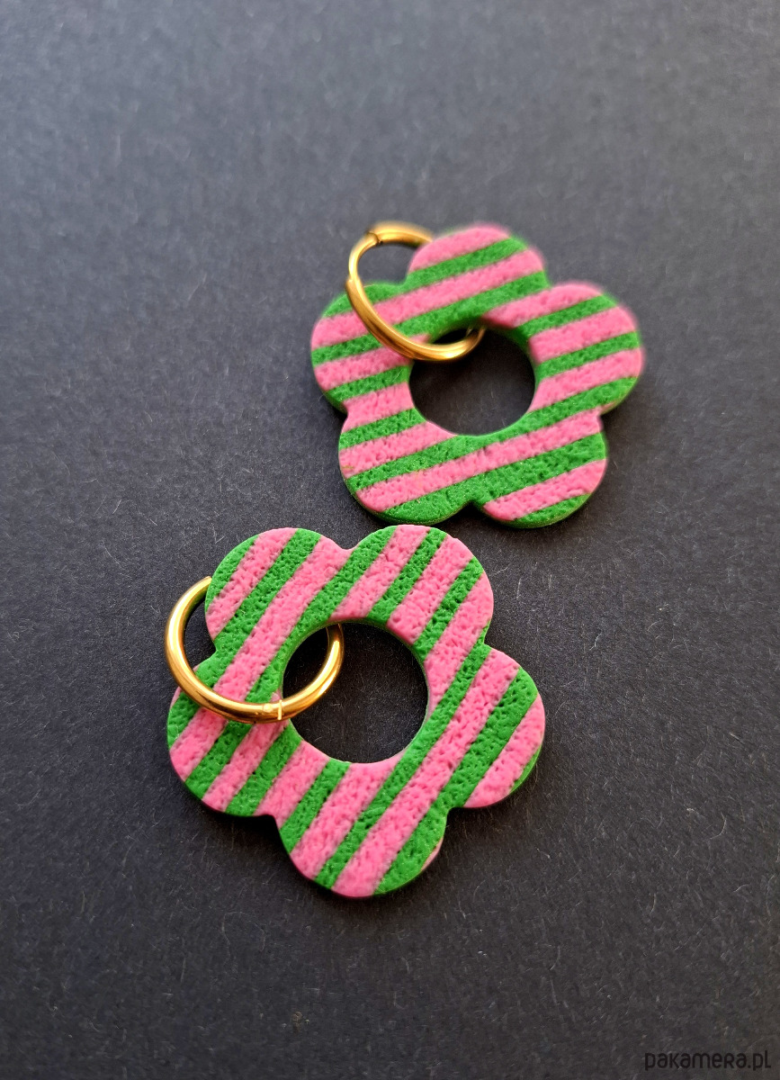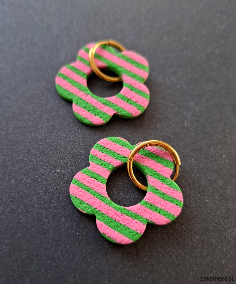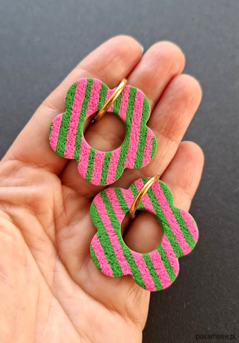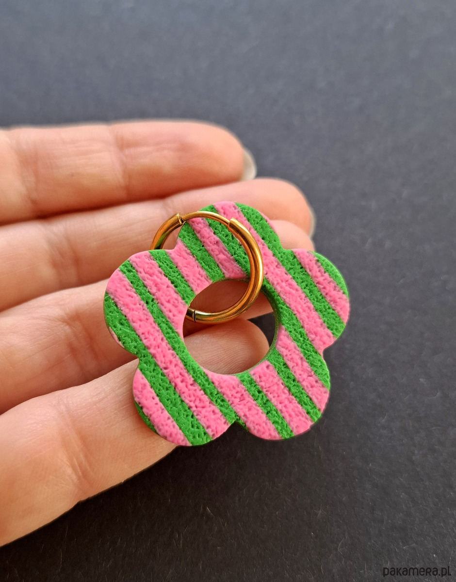 Ręcznie wykonane, lekkie kolczyki wiszące z wysokiej jakości glinki polimerowej w wiosennym stylu. Bigle typu kajdanki - z zapięciem na zatrzask, pozłacane i nieuczulające ze stali szlachetnej. Kolczyki jednostronne. Wymiary: długość całkowita - 4,2 cm, szerokość 3,5 cm. Wykonane w jedynym egzemplarzu.